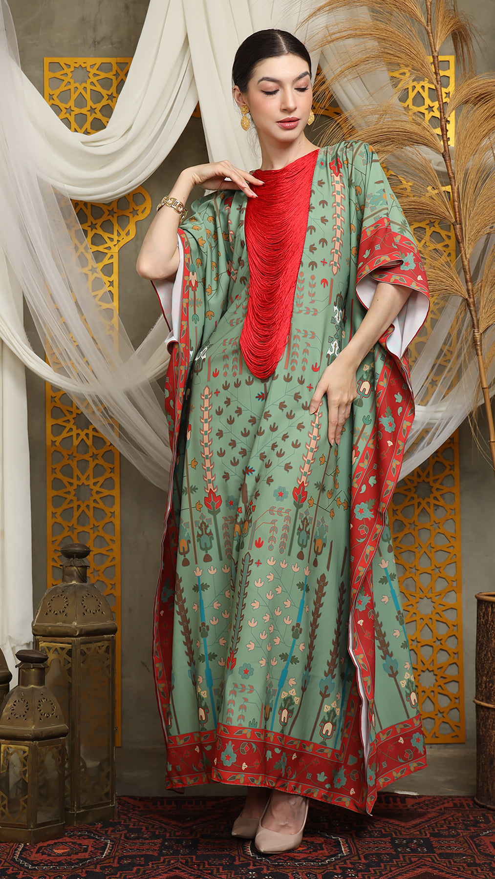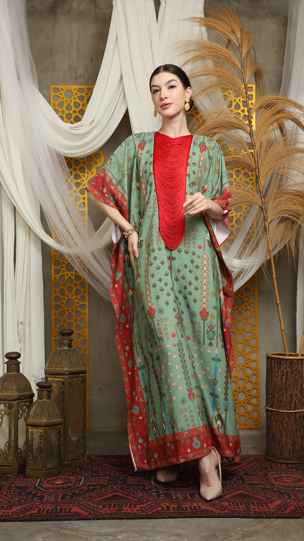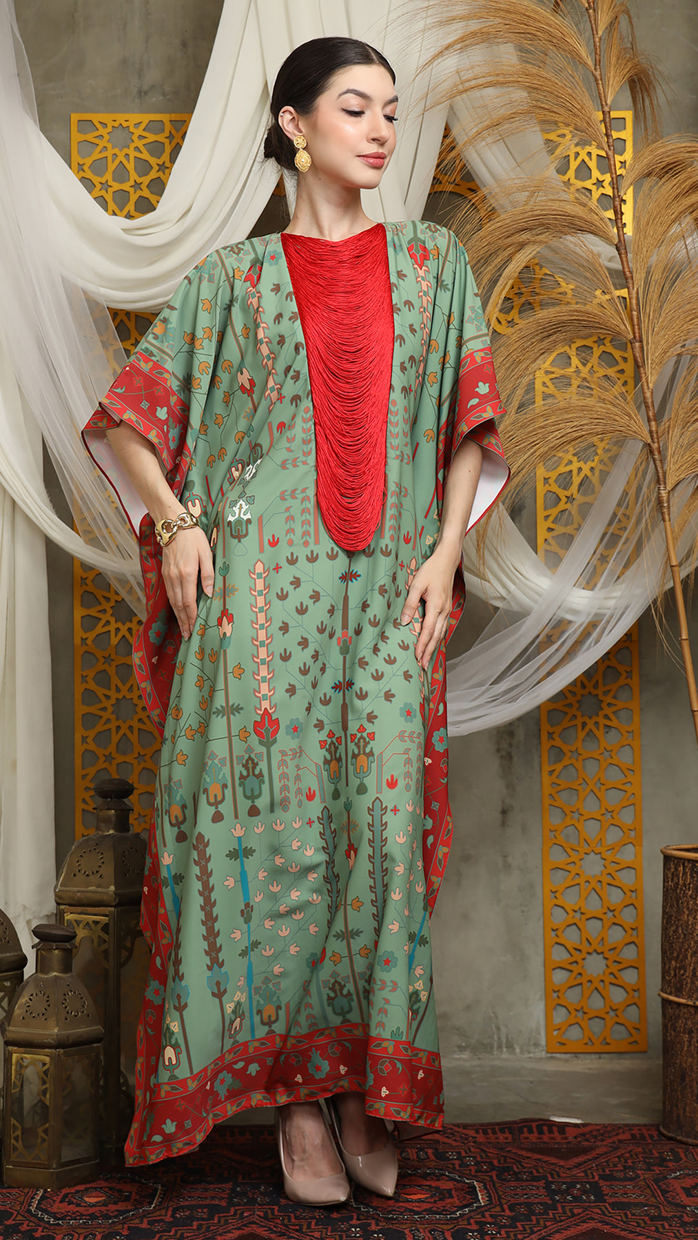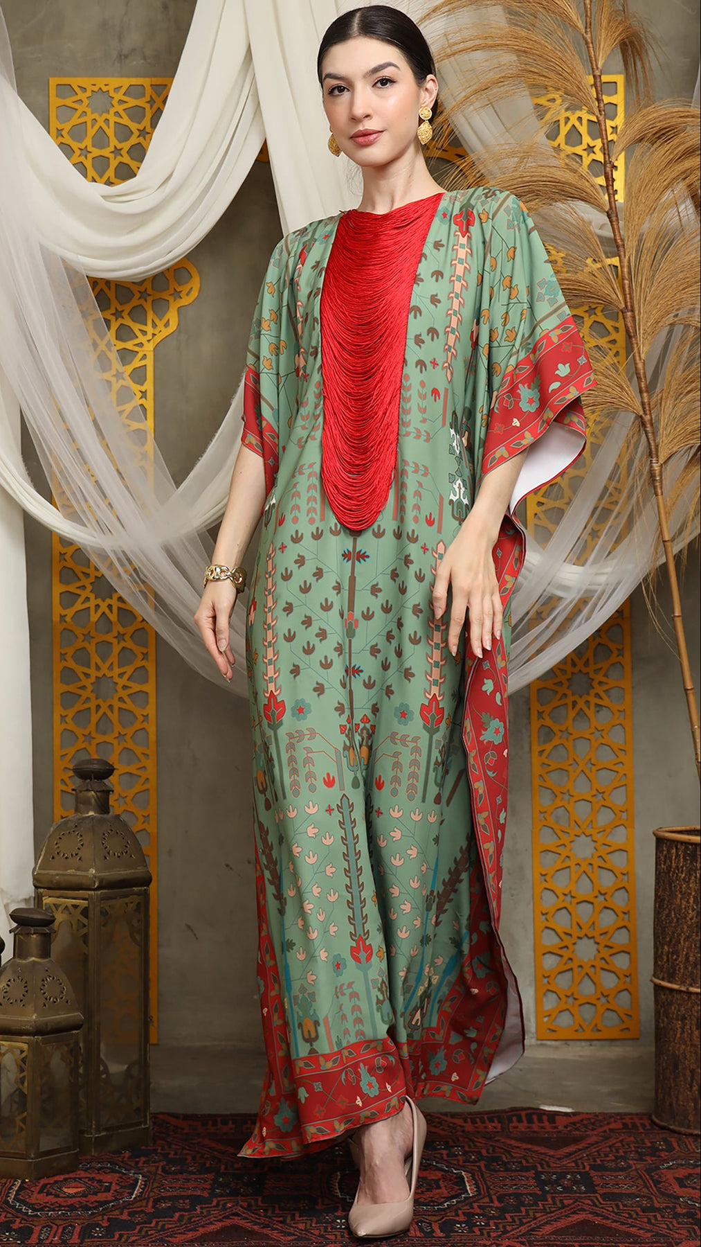 This kaftan is made from premium satin material, which has super comfortable to lounge around in, adjustable drawstring which offers a glamorous way to cover up and perfect for evening wear. A short fringe kaftan that brings effortless drama and easy elegance. Cut in a relaxed, breezy silhouette, it drapes beautifully over the body while allowing freedom of movement. The playful fringe detailing adds texture and motion, swaying with every step for a touch of bohemian glamour