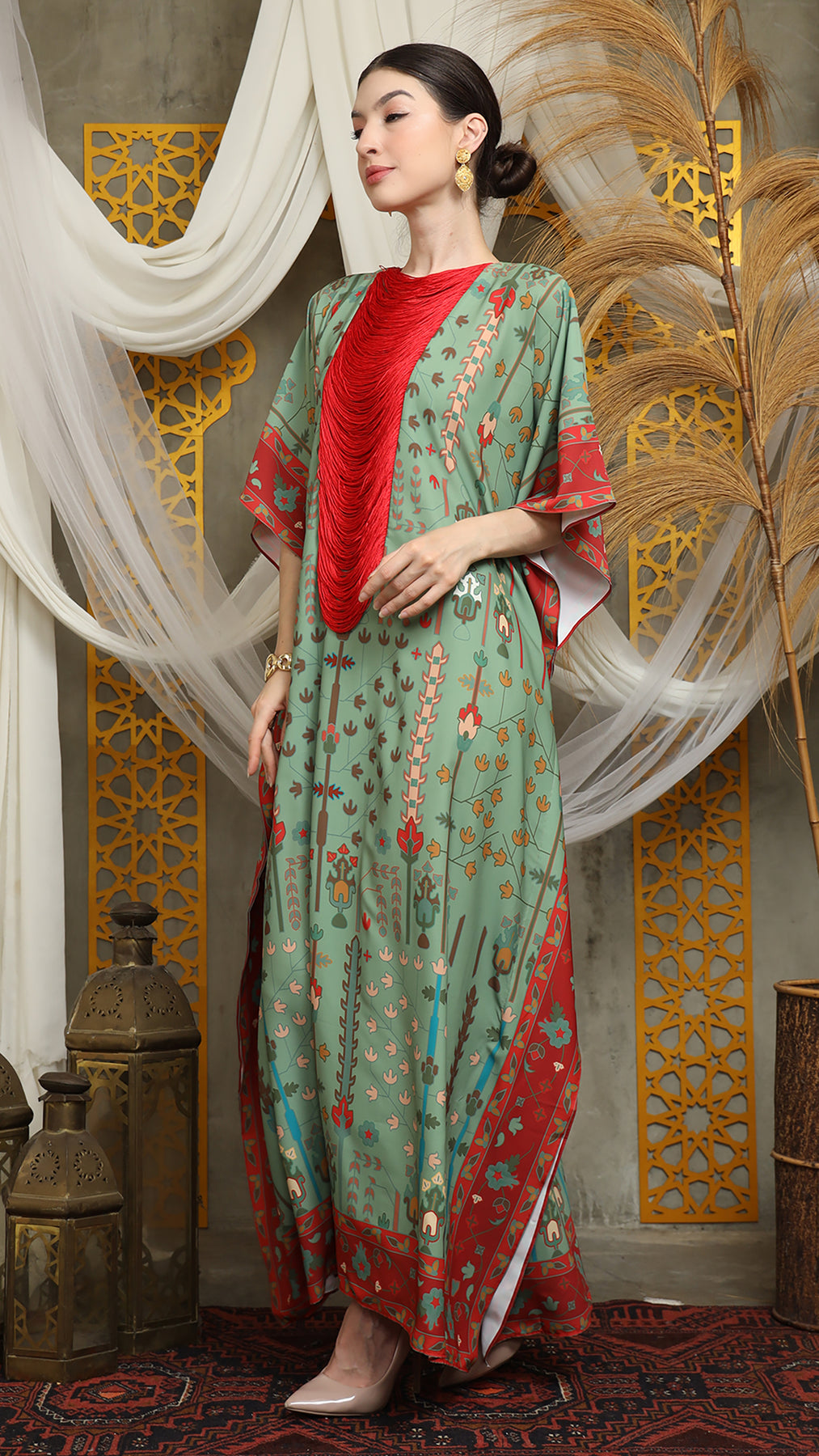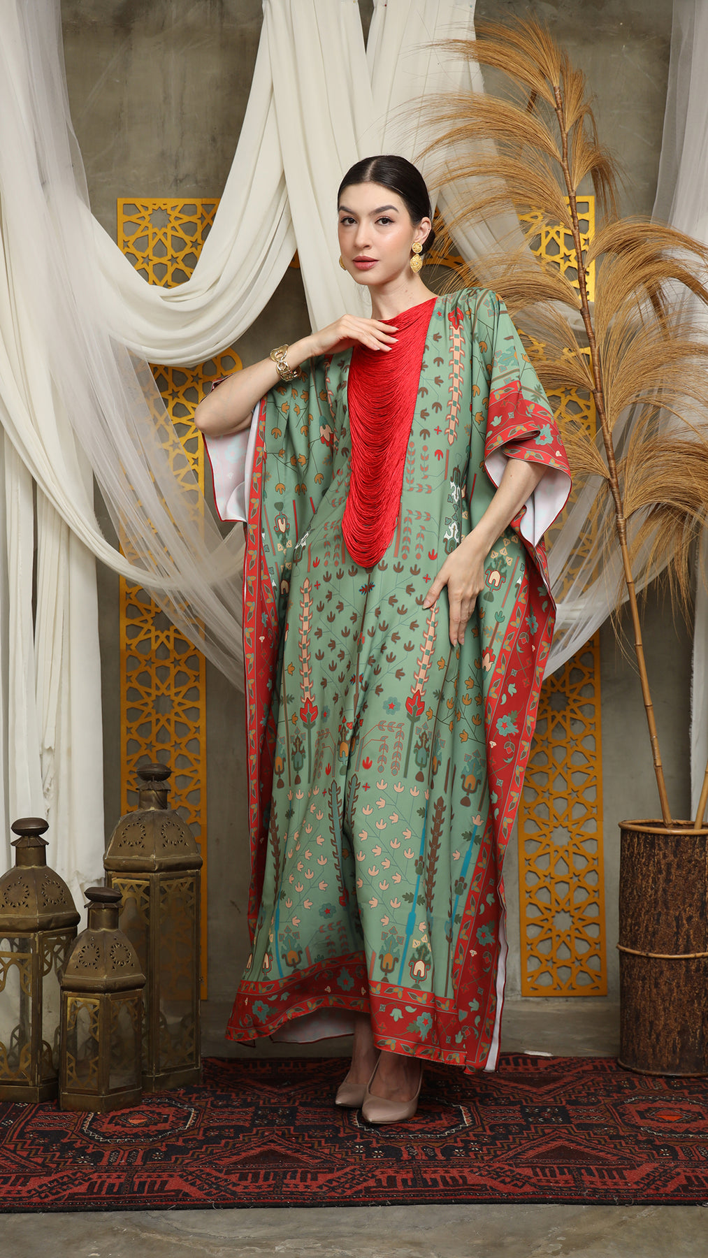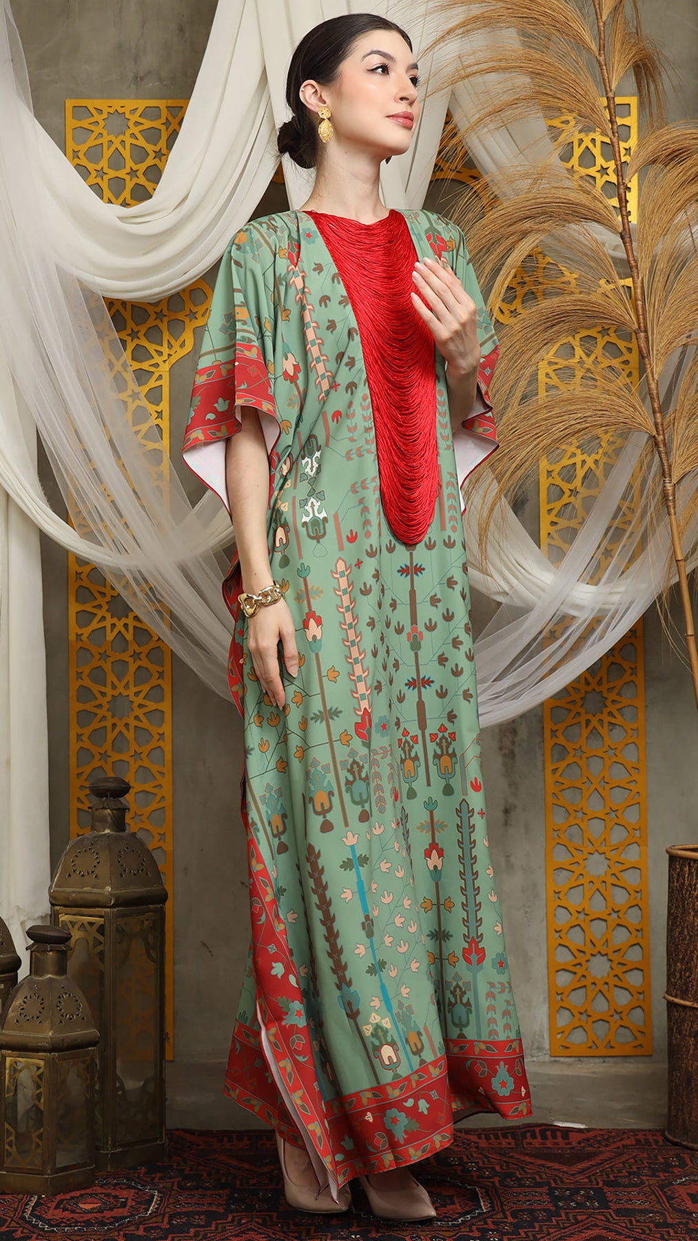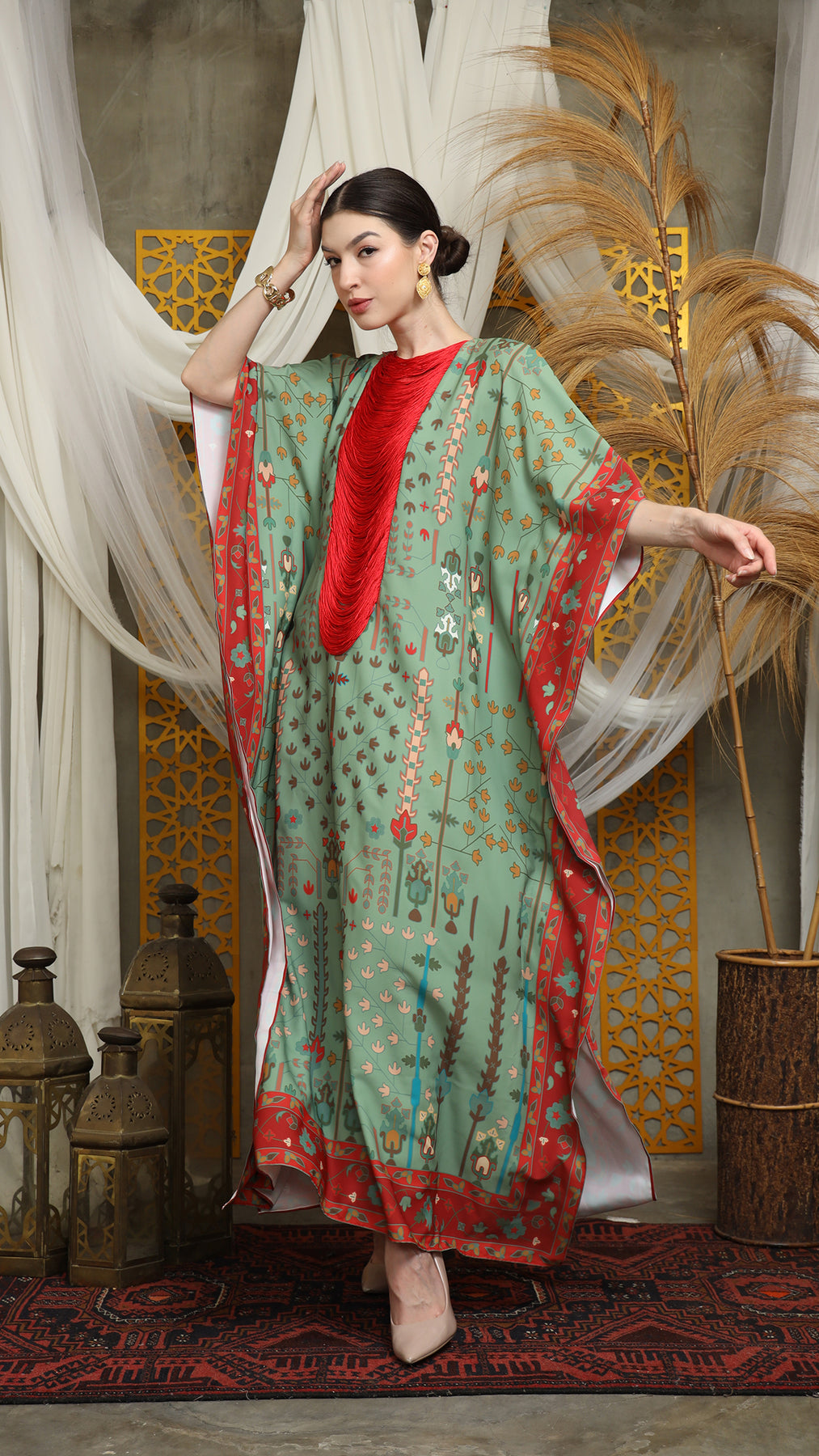 This kaftan is made from premium satin material, which has super comfortable to lounge around in, adjustable drawstring which offers a glamorous way to cover up and perfect for evening wear. A short fringe kaftan that brings effortless drama and easy elegance. Cut in a relaxed, breezy silhouette, it drapes beautifully over the body while allowing freedom of movement. The playful fringe detailing adds texture and motion, swaying with every step for a touch of bohemian glamour