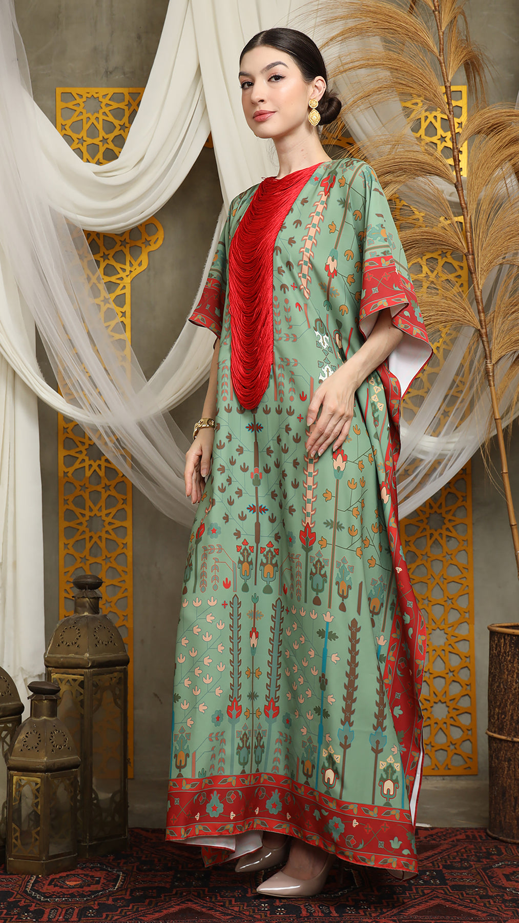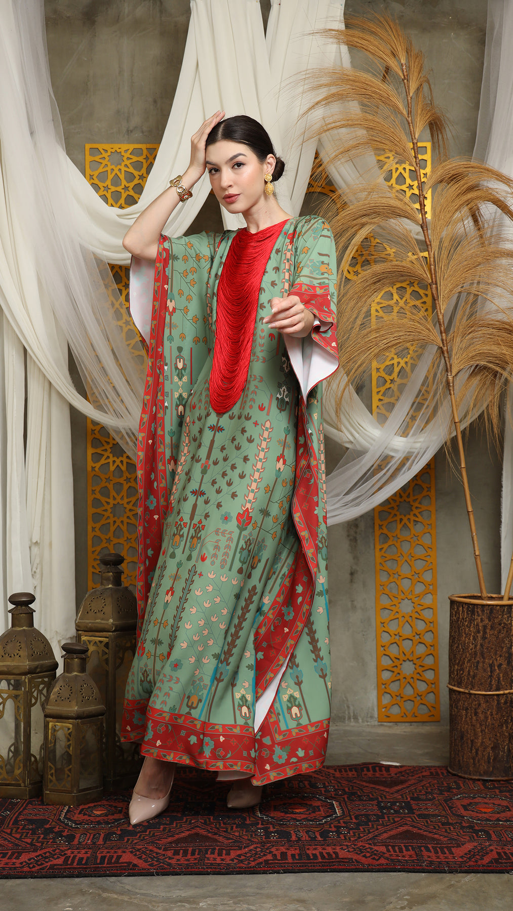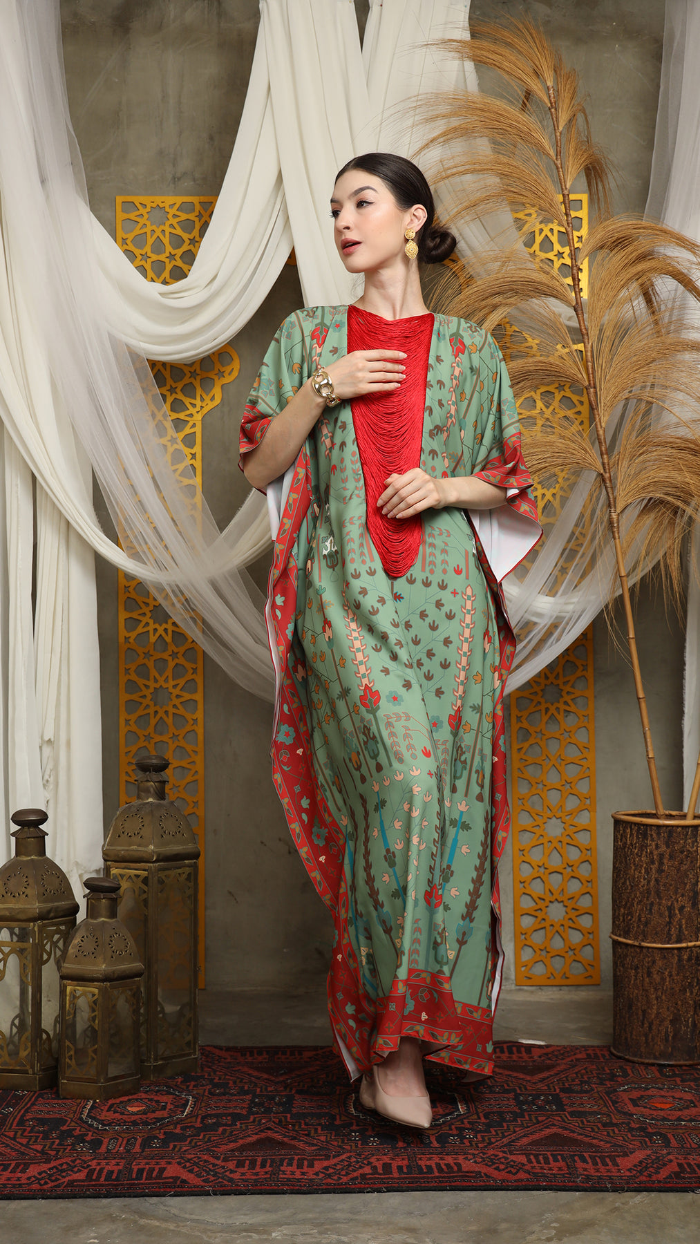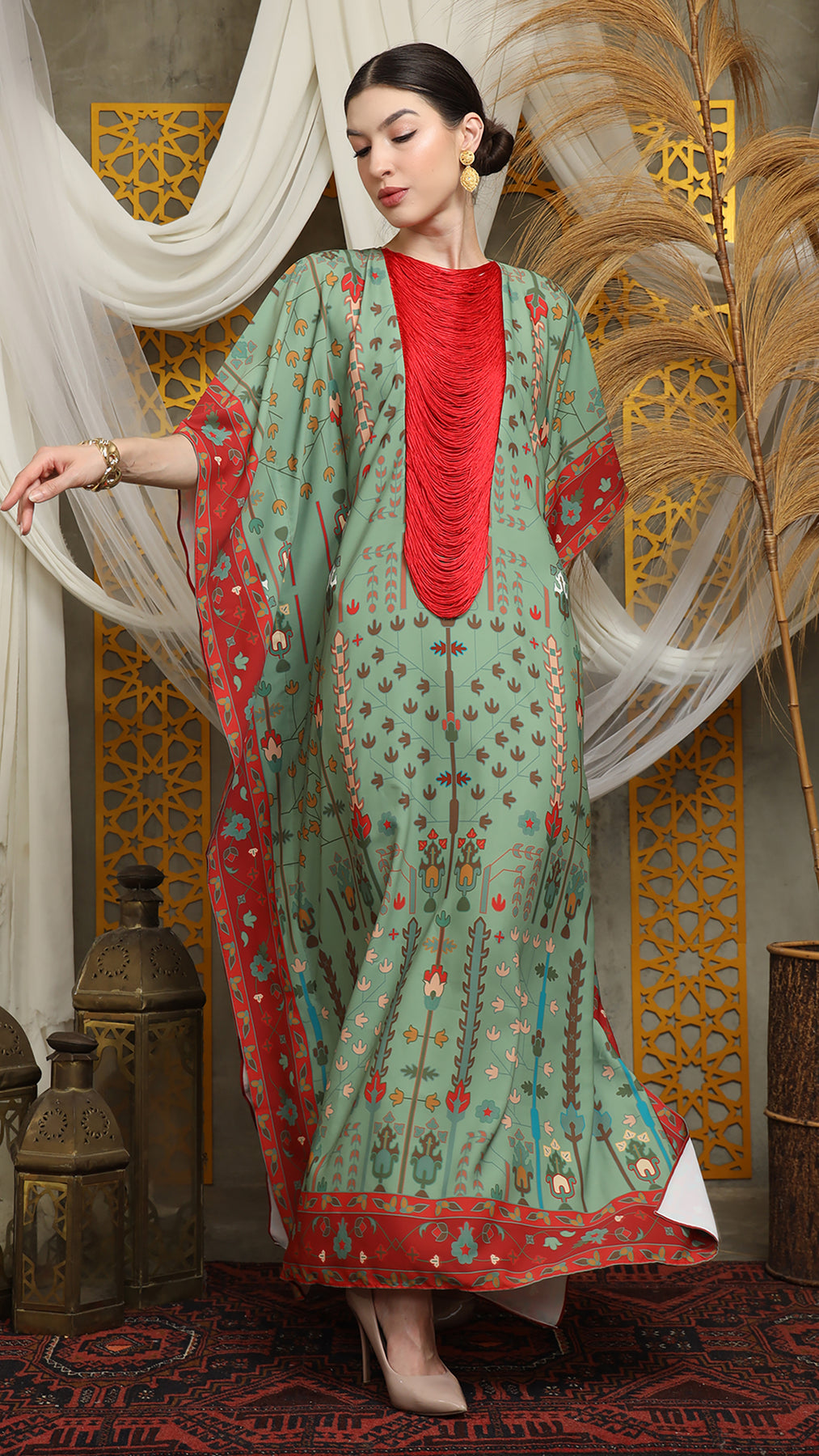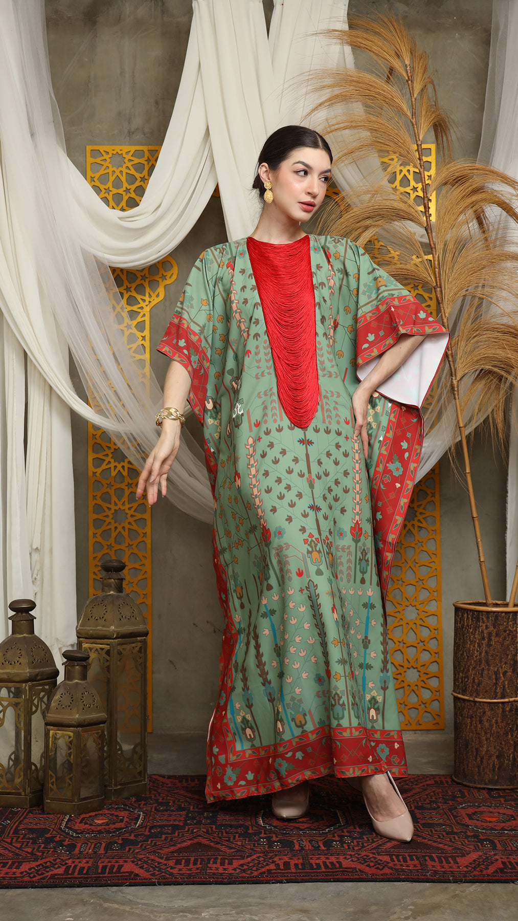 This kaftan is made from premium satin material, which has super comfortable to lounge around in, adjustable drawstring which offers a glamorous way to cover up and perfect for evening wear. A short fringe kaftan that brings effortless drama and easy elegance. Cut in a relaxed, breezy silhouette, it drapes beautifully over the body while allowing freedom of movement. The playful fringe detailing adds texture and motion, swaying with every step for a touch of bohemian glamour