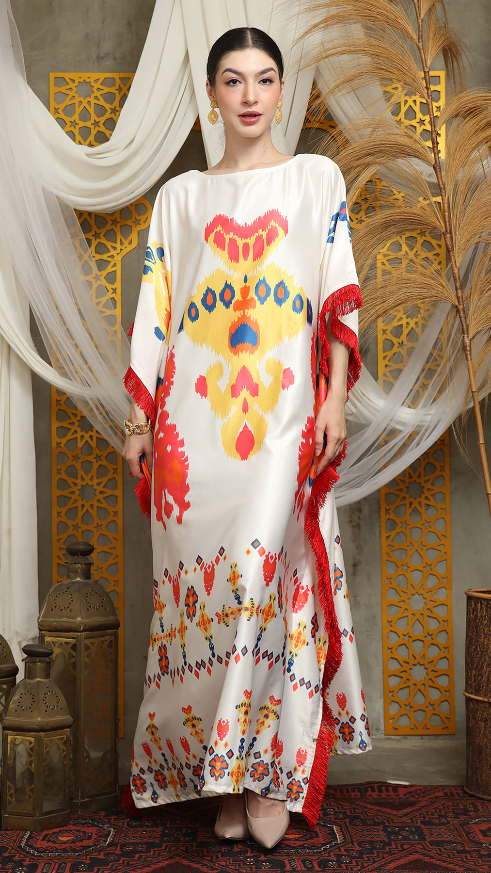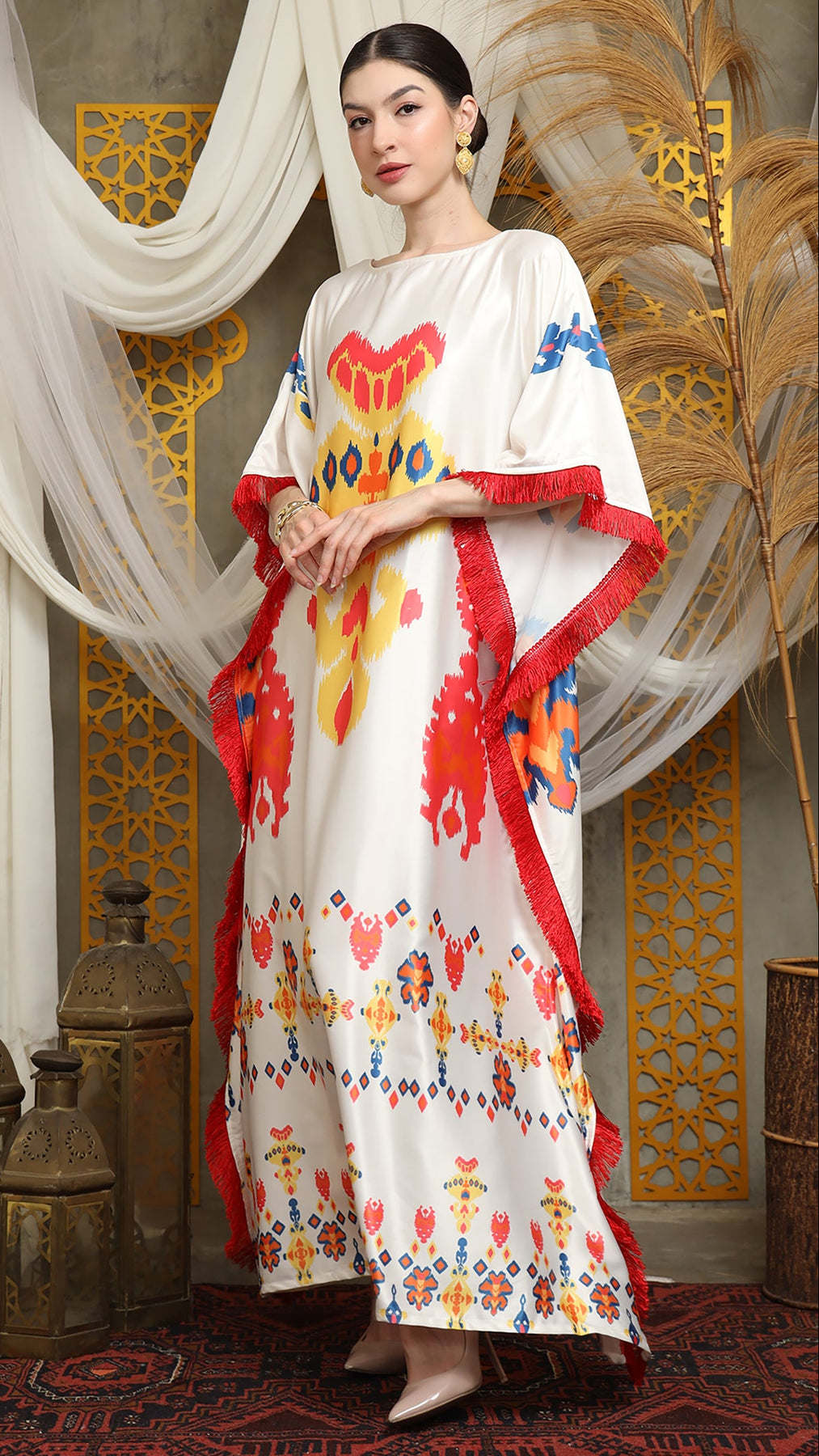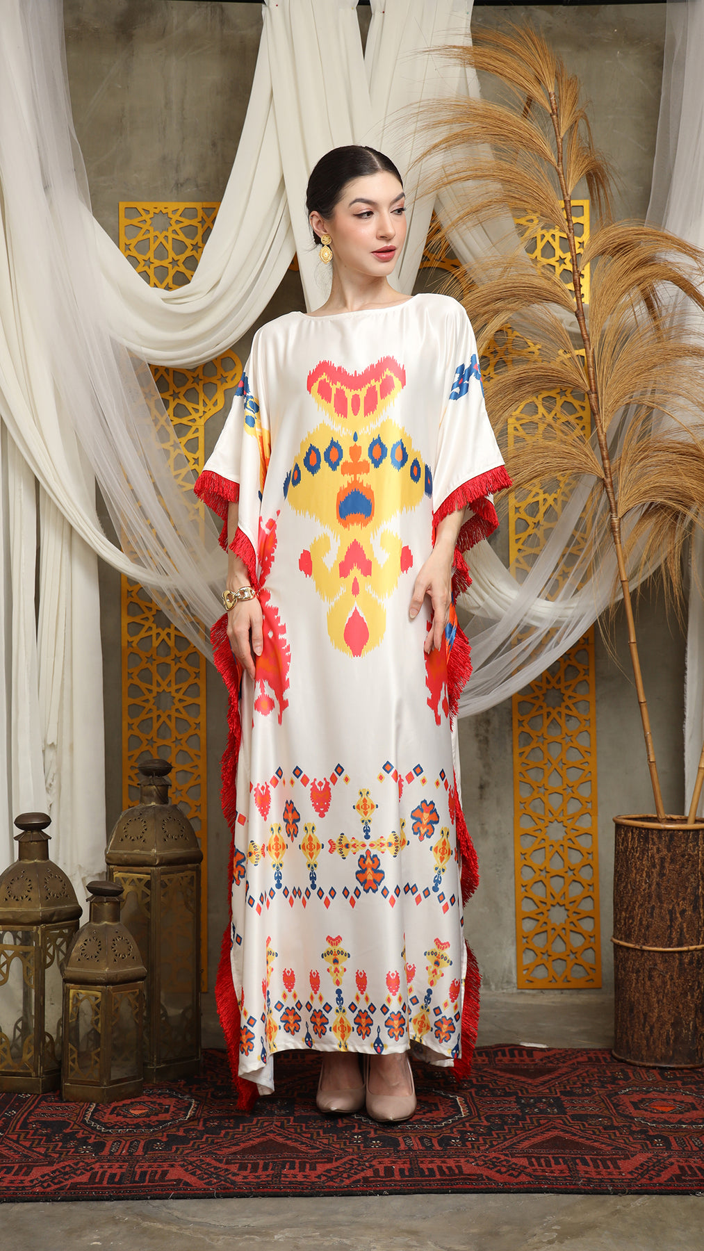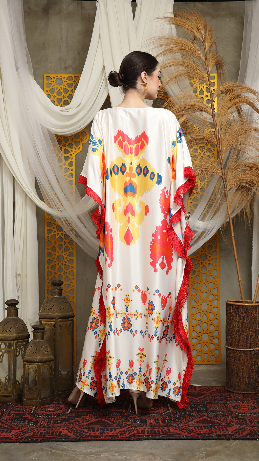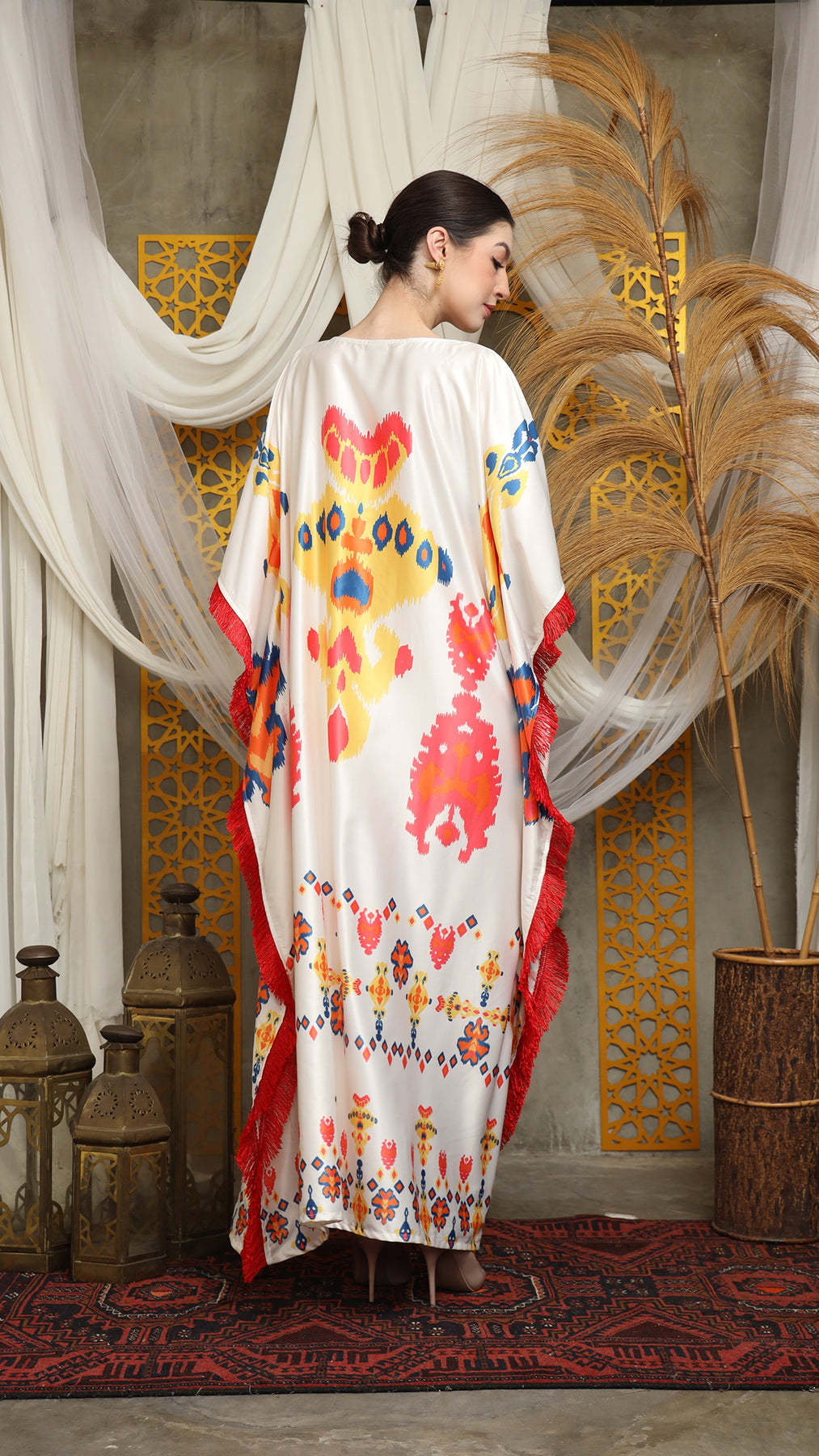 This kaftan is made from premium satin material, which has super comfortable to lounge around in, adjustable drawstring, and flattering neckline is an added feature which offers a glamorous way to cover up and perfect for evening wear. A short fringe kaftan that brings effortless drama and easy elegance. Cut in a relaxed, breezy silhouette, it drapes beautifully over the body while allowing freedom of movement. The playful fringe detailing adds texture and motion, swaying with every step for a touch of bohemian glamour