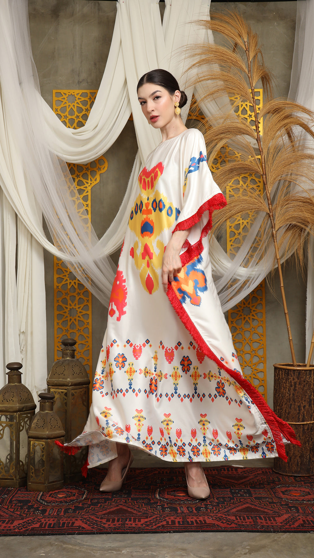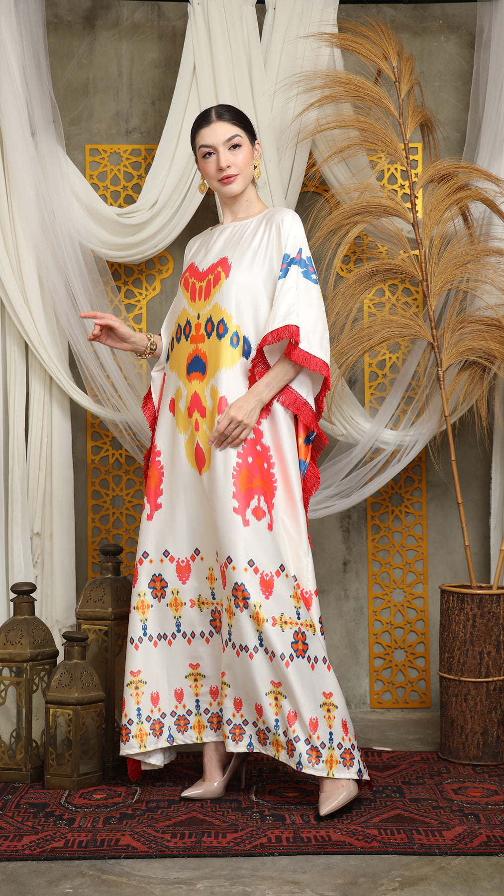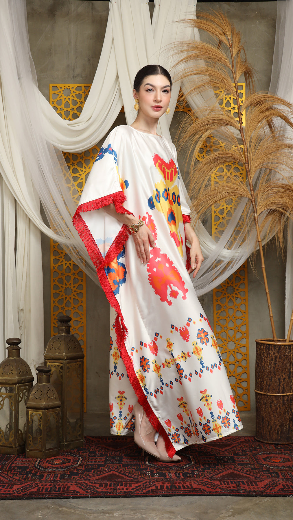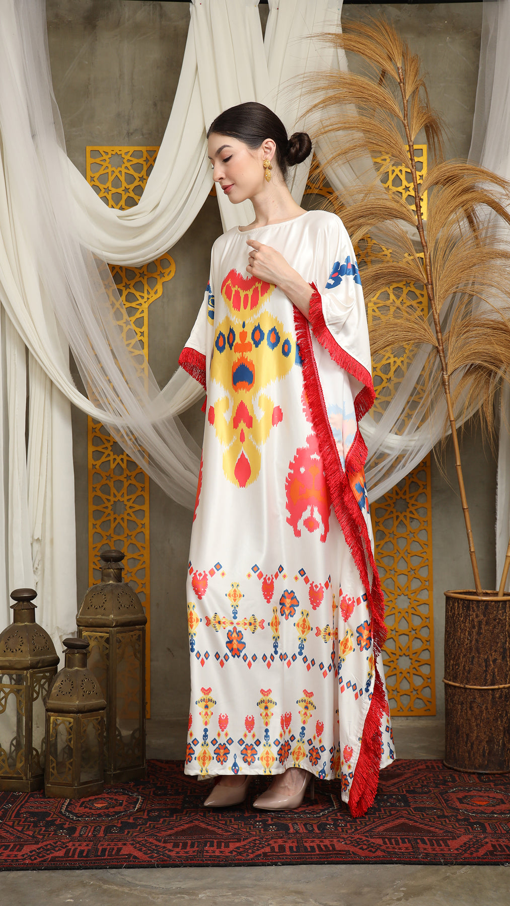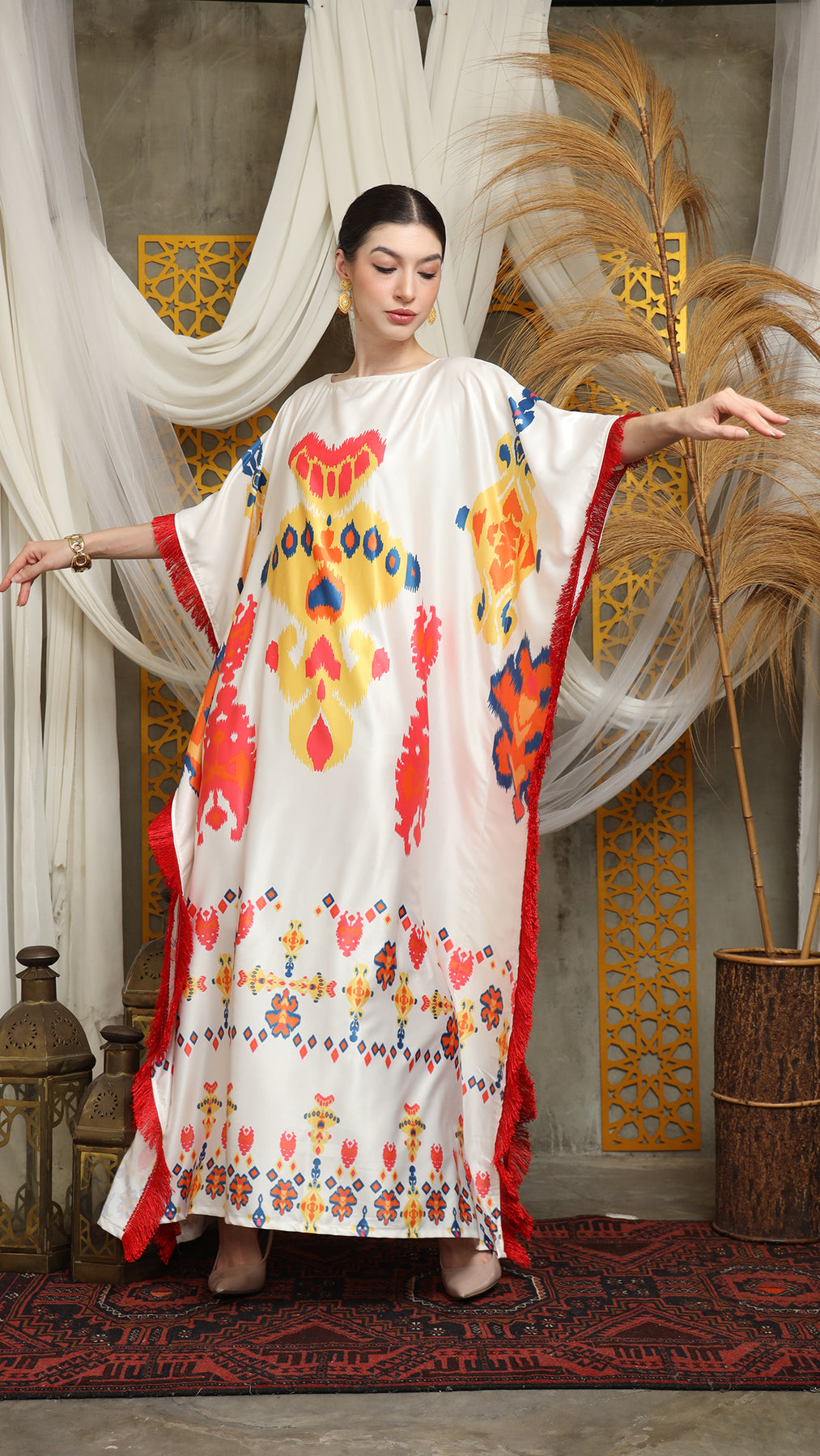 This kaftan is made from premium satin material, which has super comfortable to lounge around in, adjustable drawstring, and flattering neckline is an added feature which offers a glamorous way to cover up and perfect for evening wear. A short fringe kaftan that brings effortless drama and easy elegance. Cut in a relaxed, breezy silhouette, it drapes beautifully over the body while allowing freedom of movement. The playful fringe detailing adds texture and motion, swaying with every step for a touch of bohemian glamour