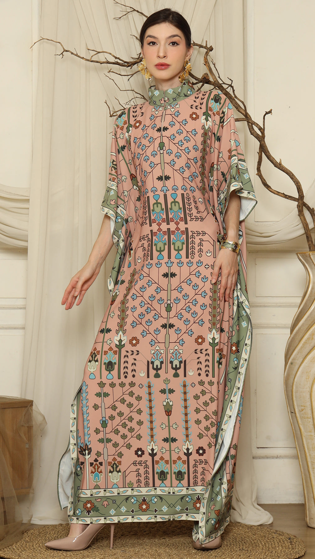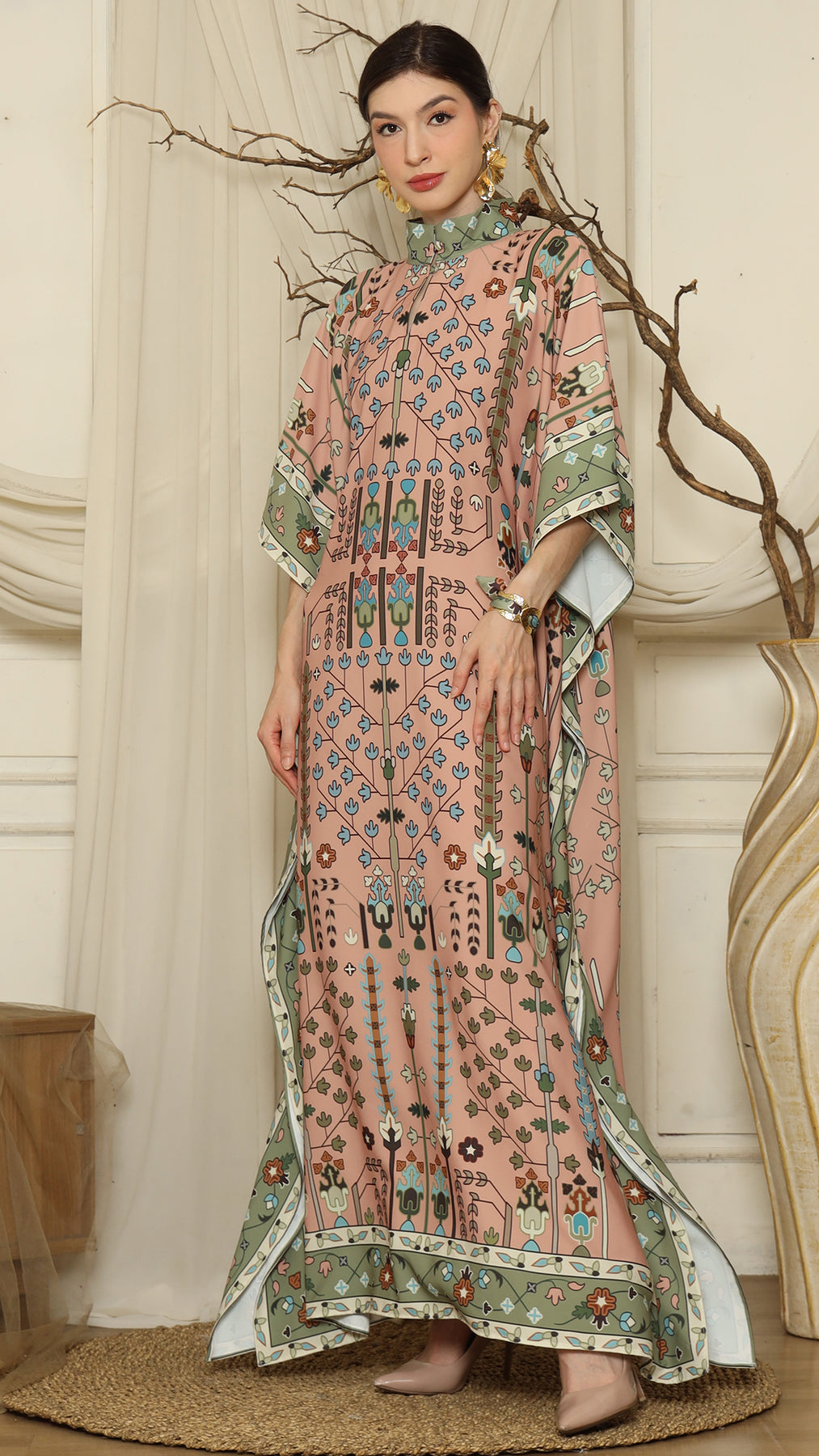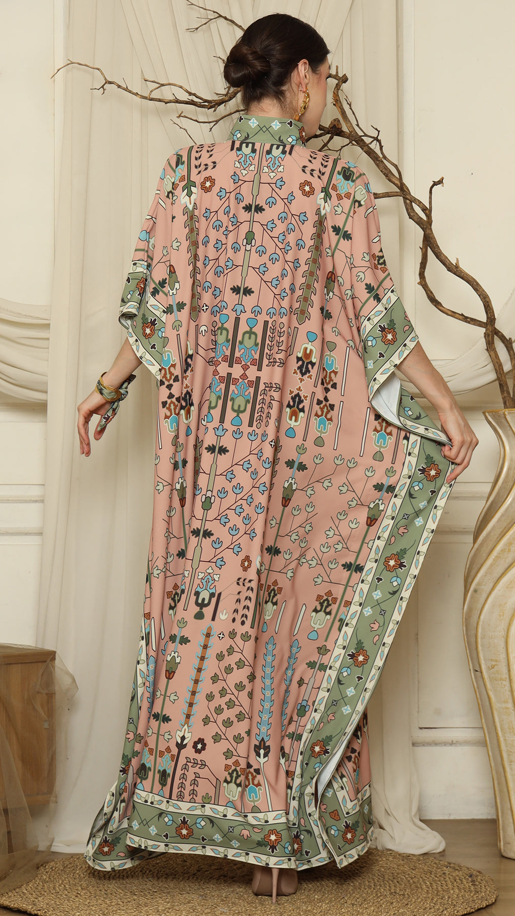 This kaftan made from lightweight satin material, which has super comfortable to lounge around in, adjustable drawstring and High Collar neckline with front buttons is an added feature which offers a glamorous way to cover up and perfect for evening wear.