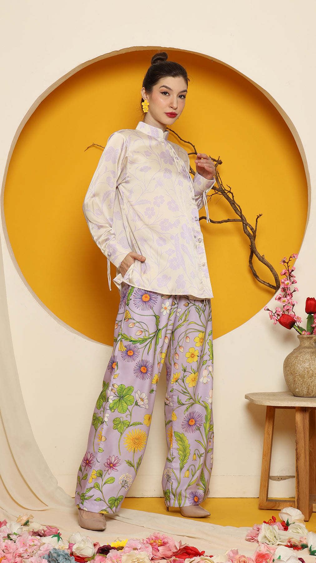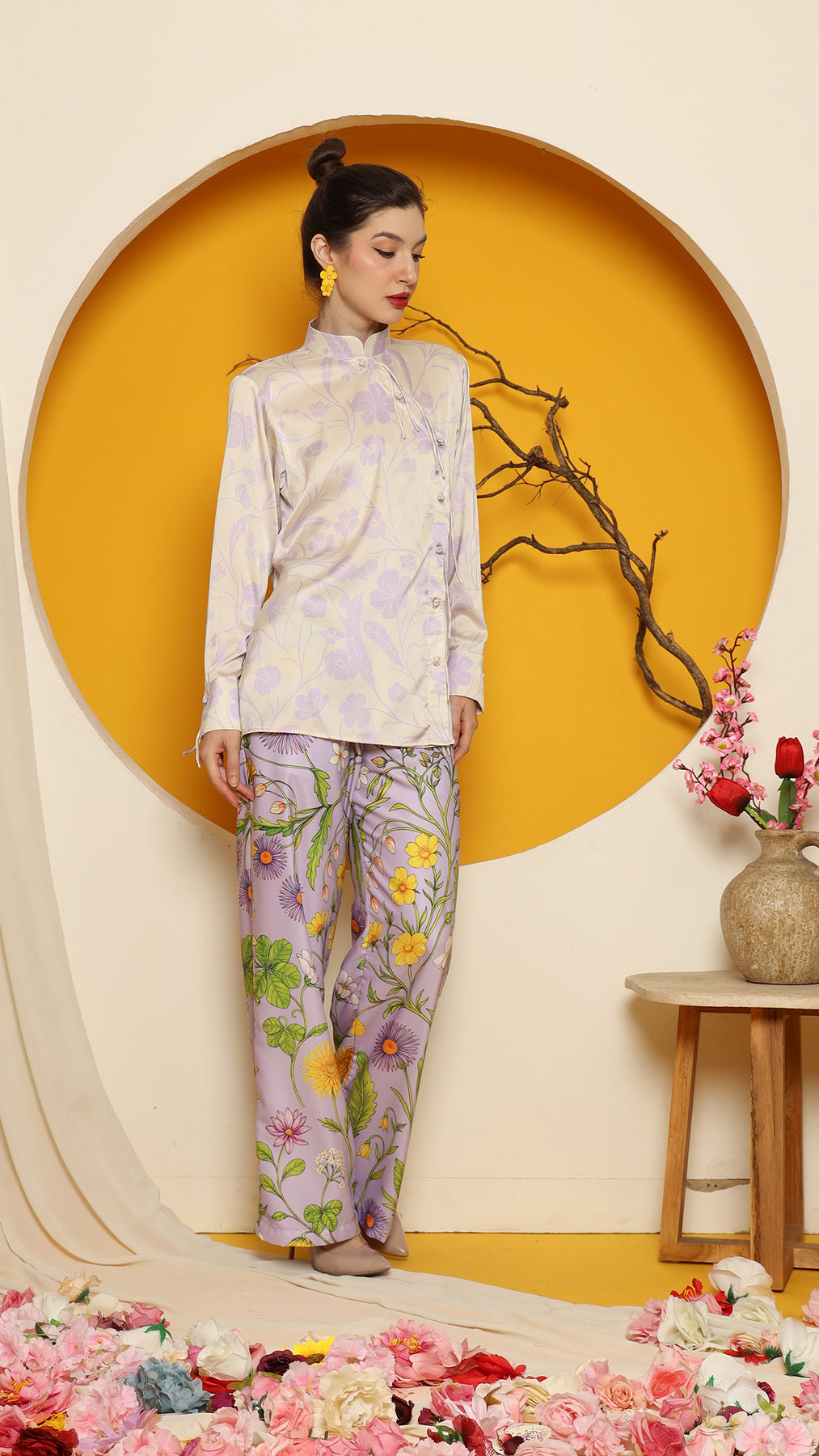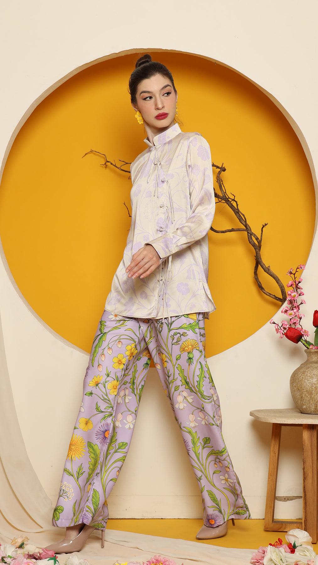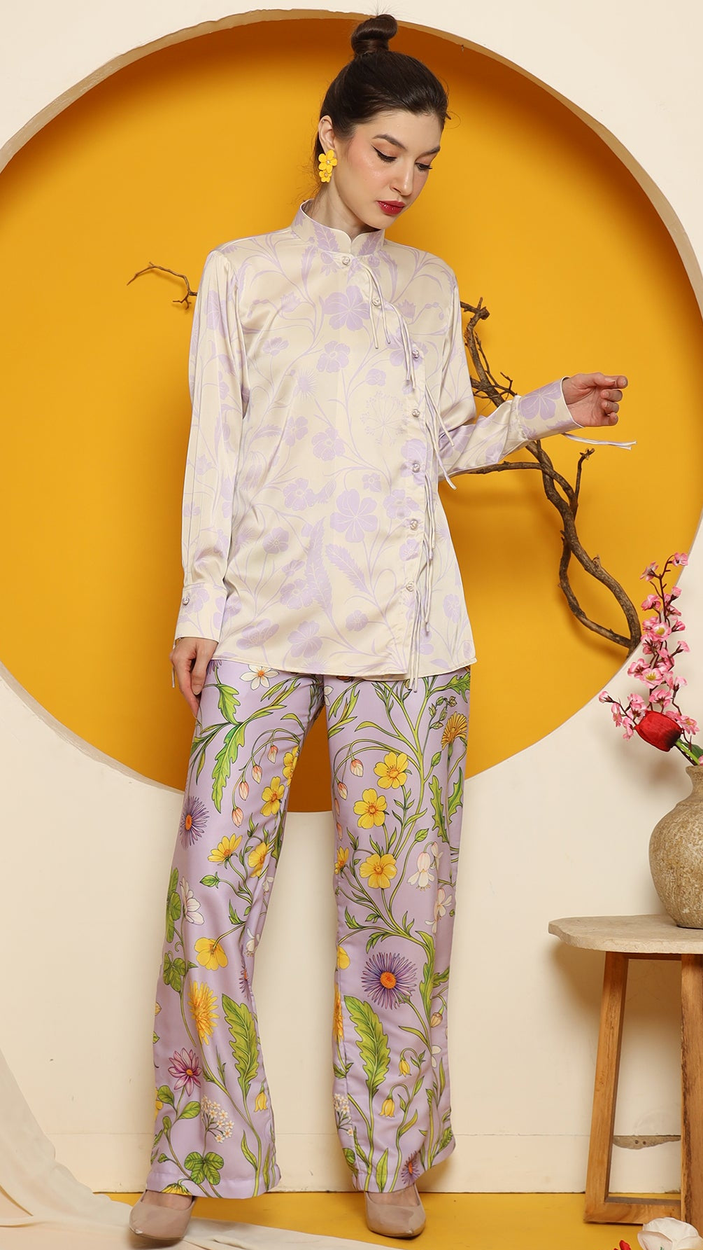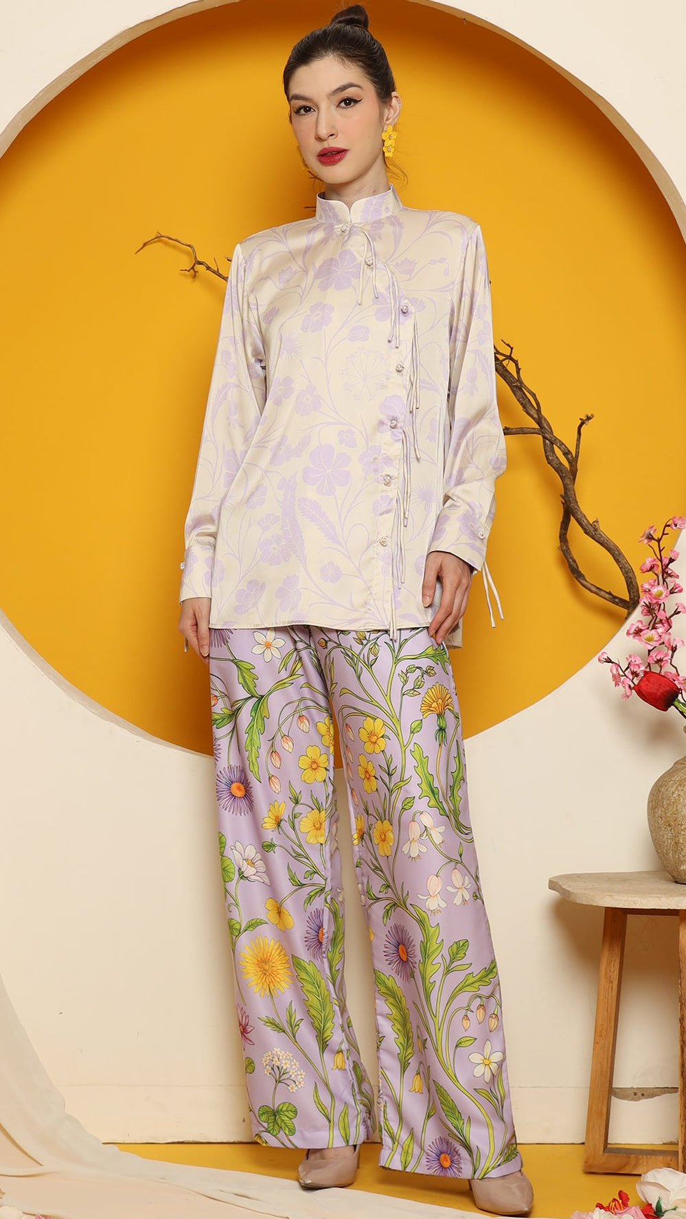 This refined ensemble includes cheongsam long top, showcasing an elegant flower motif. The shirt features a clean, minimalistic design perfect for a timeless look. Paired with it is a premium satin pants adorned with floral patterns
