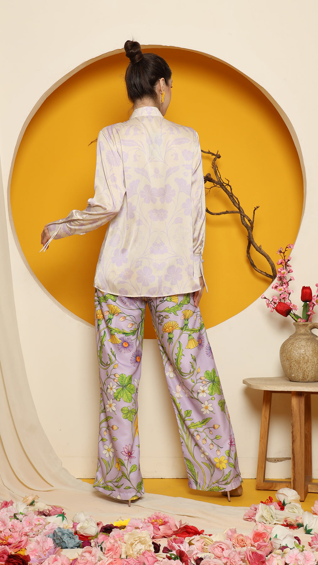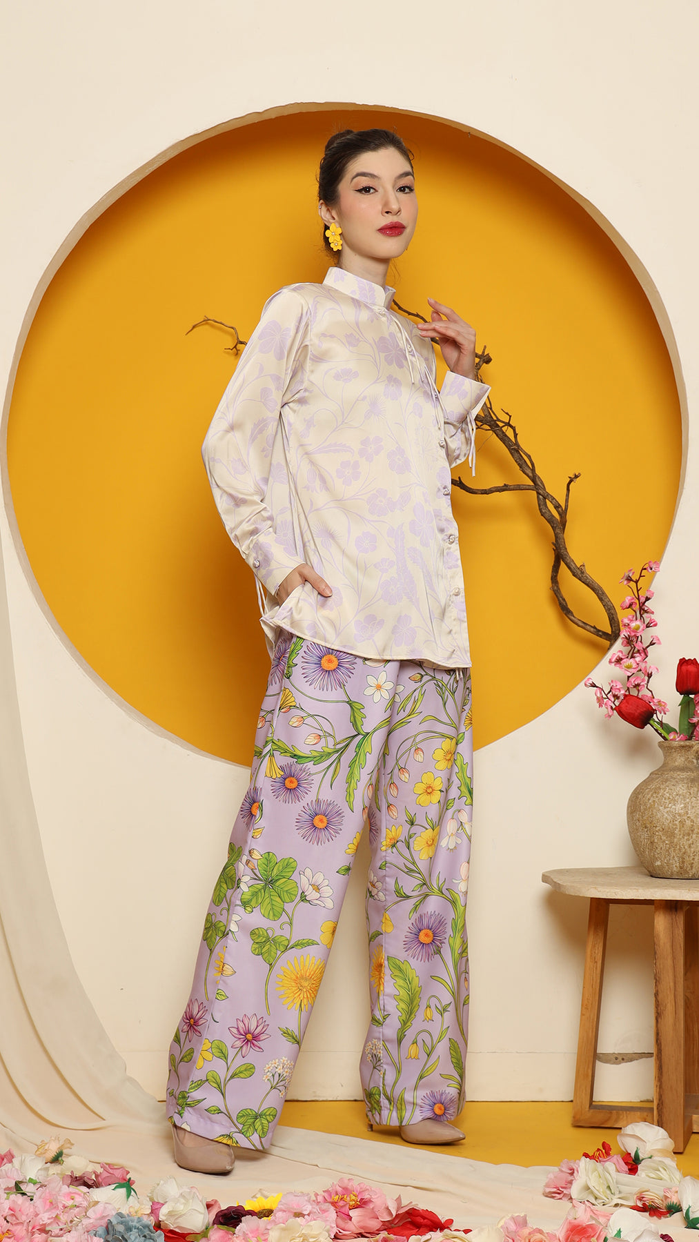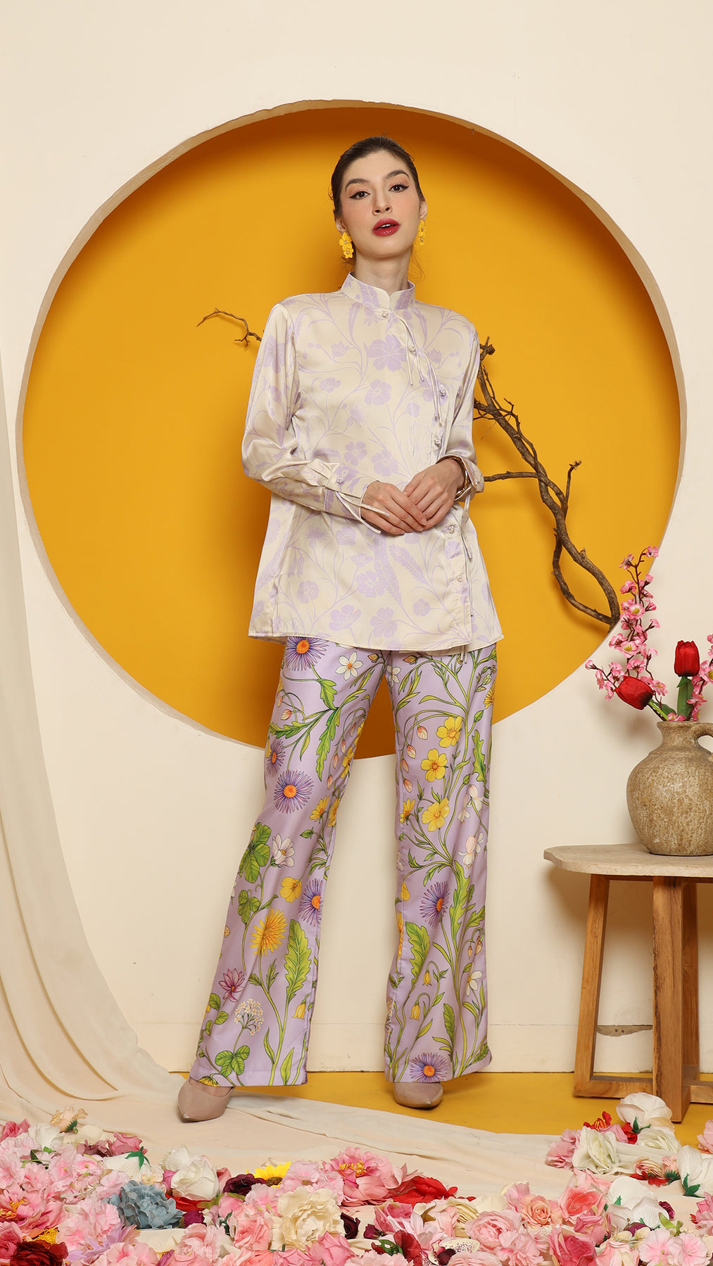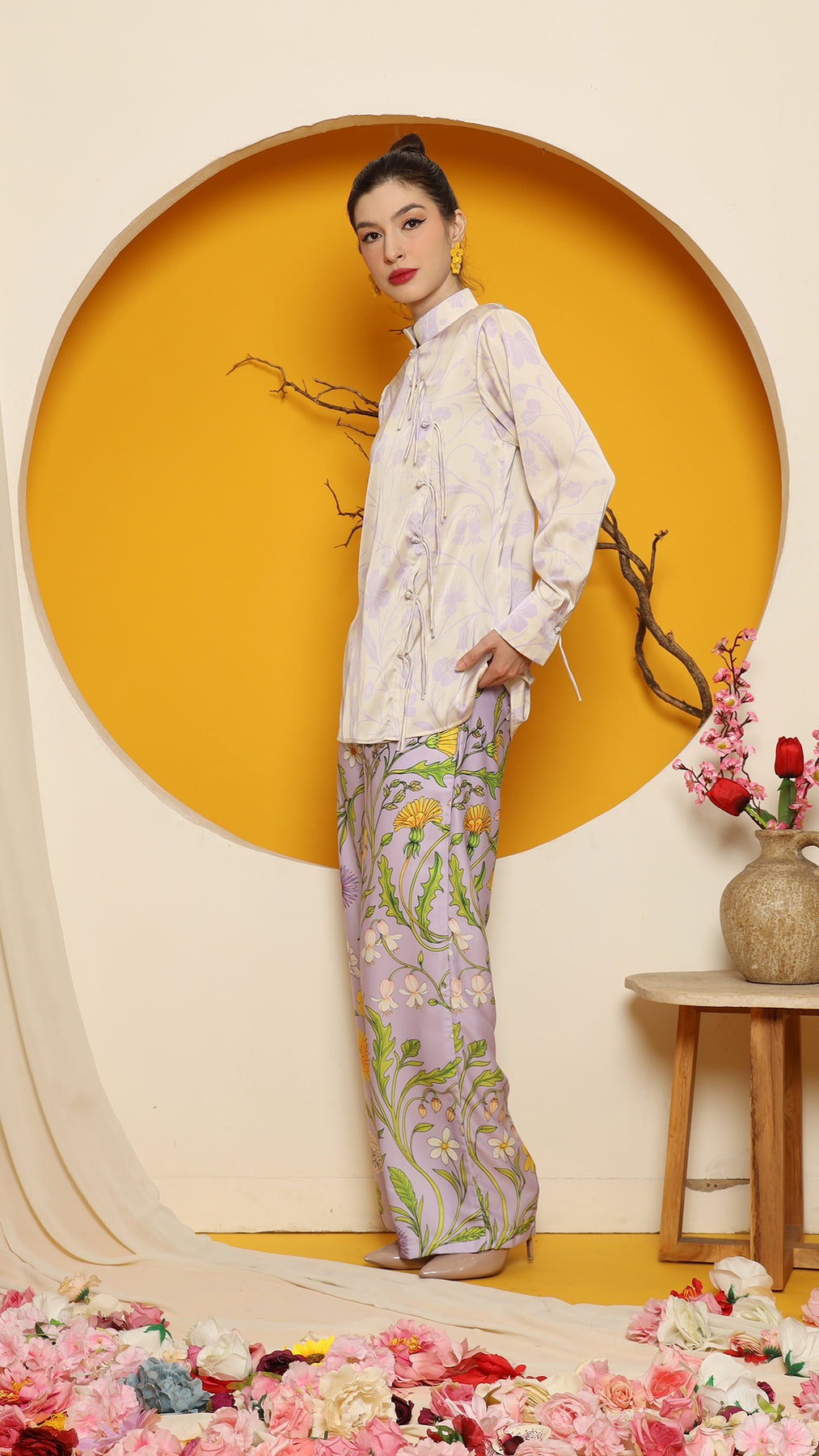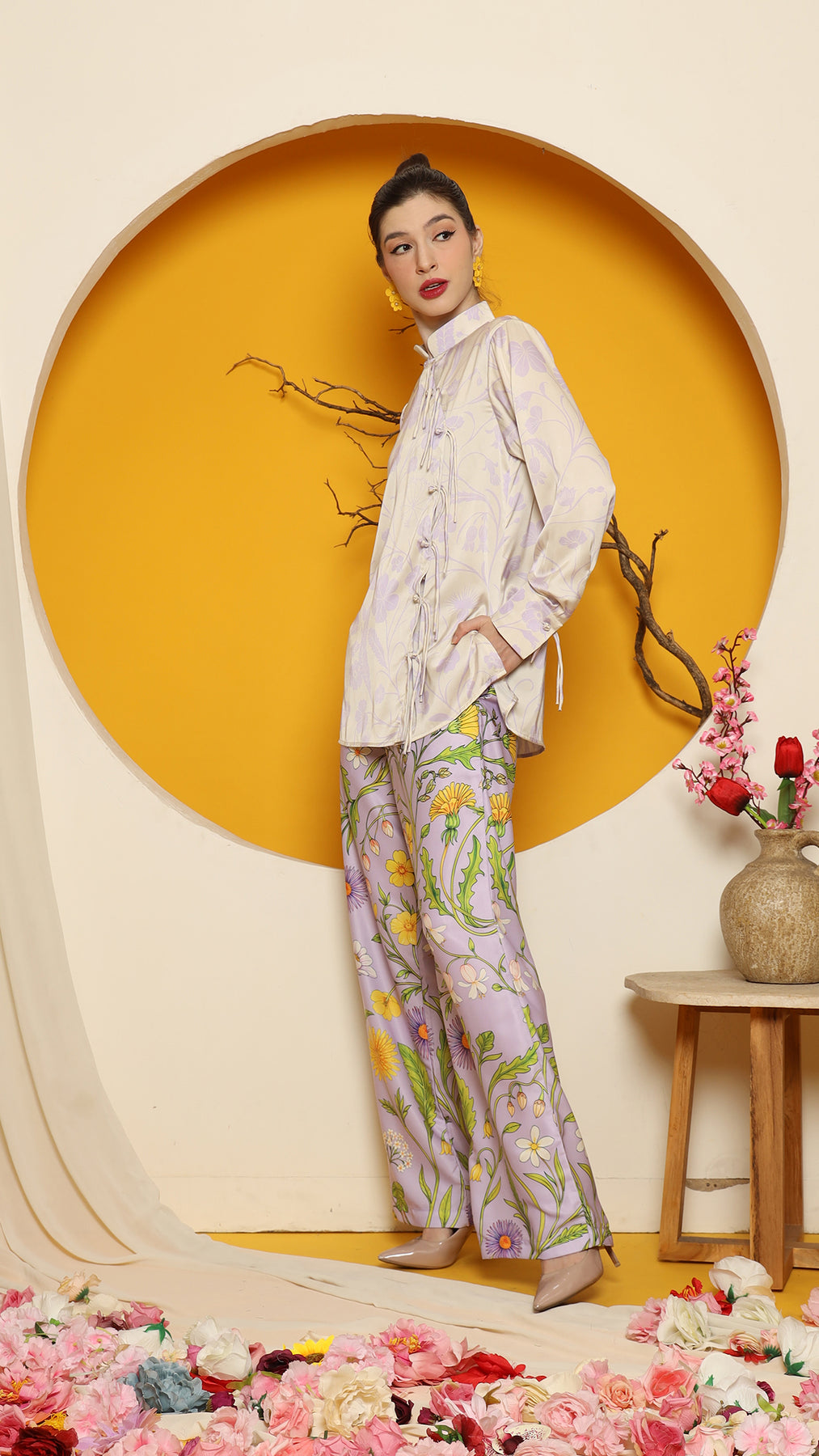 This refined ensemble includes cheongsam long top, showcasing an elegant flower motif. The shirt features a clean, minimalistic design perfect for a timeless look. Paired with it is a premium satin pants adorned with floral patterns