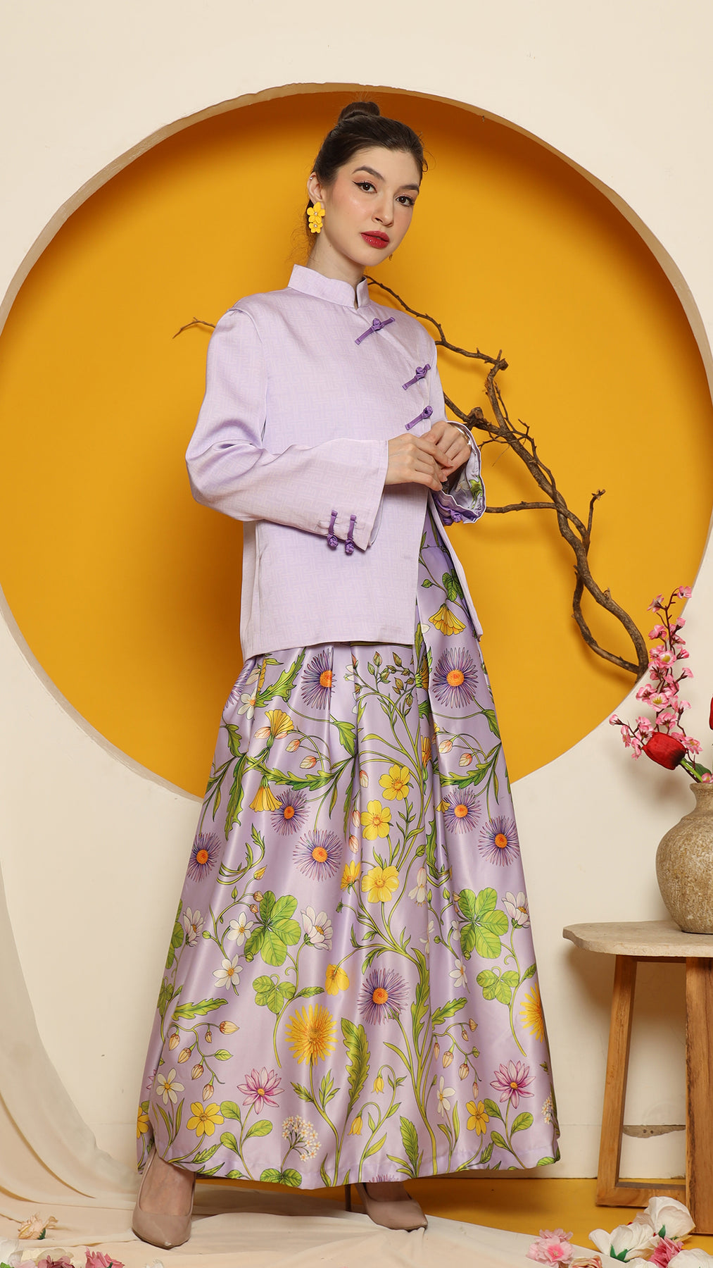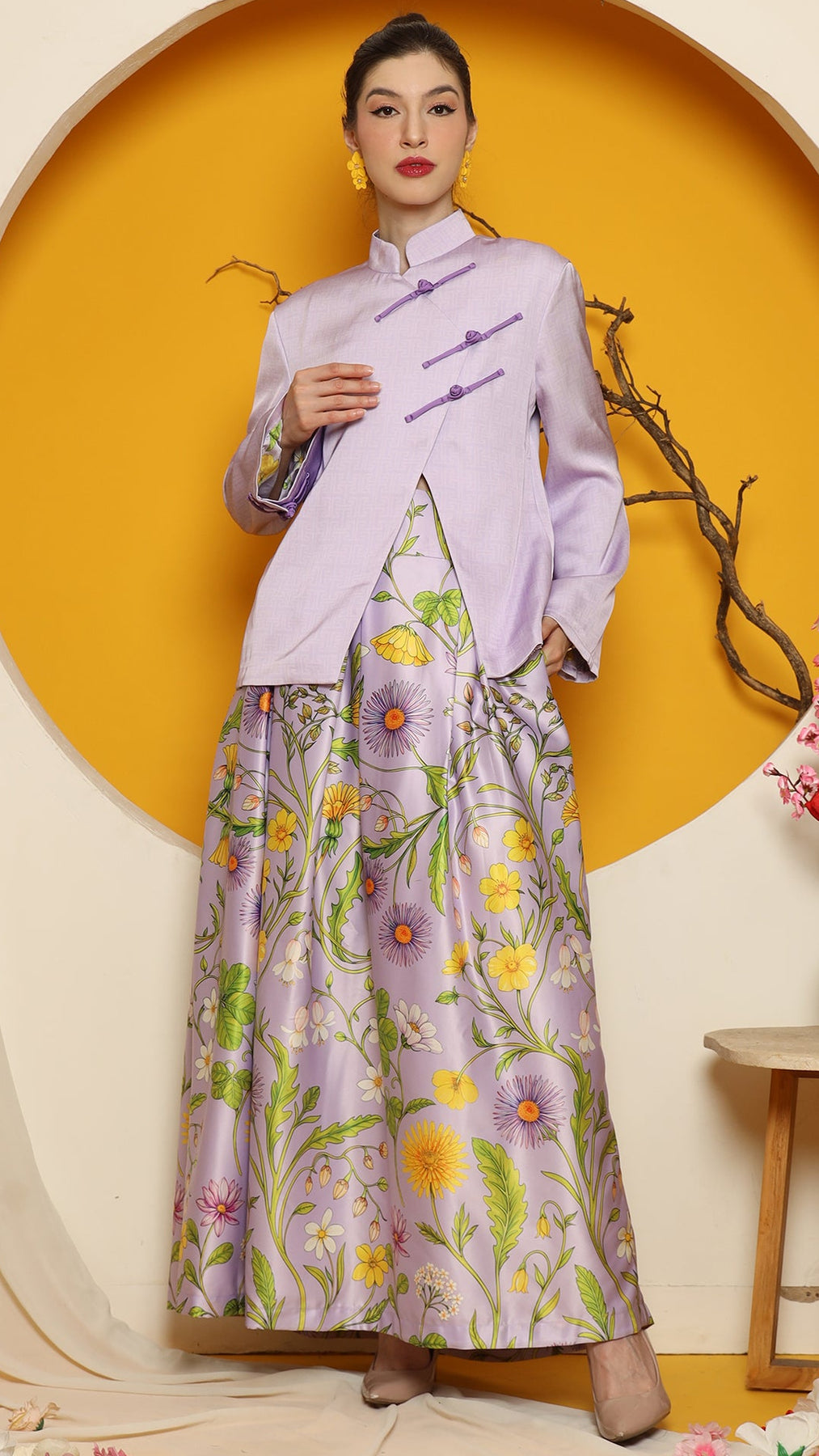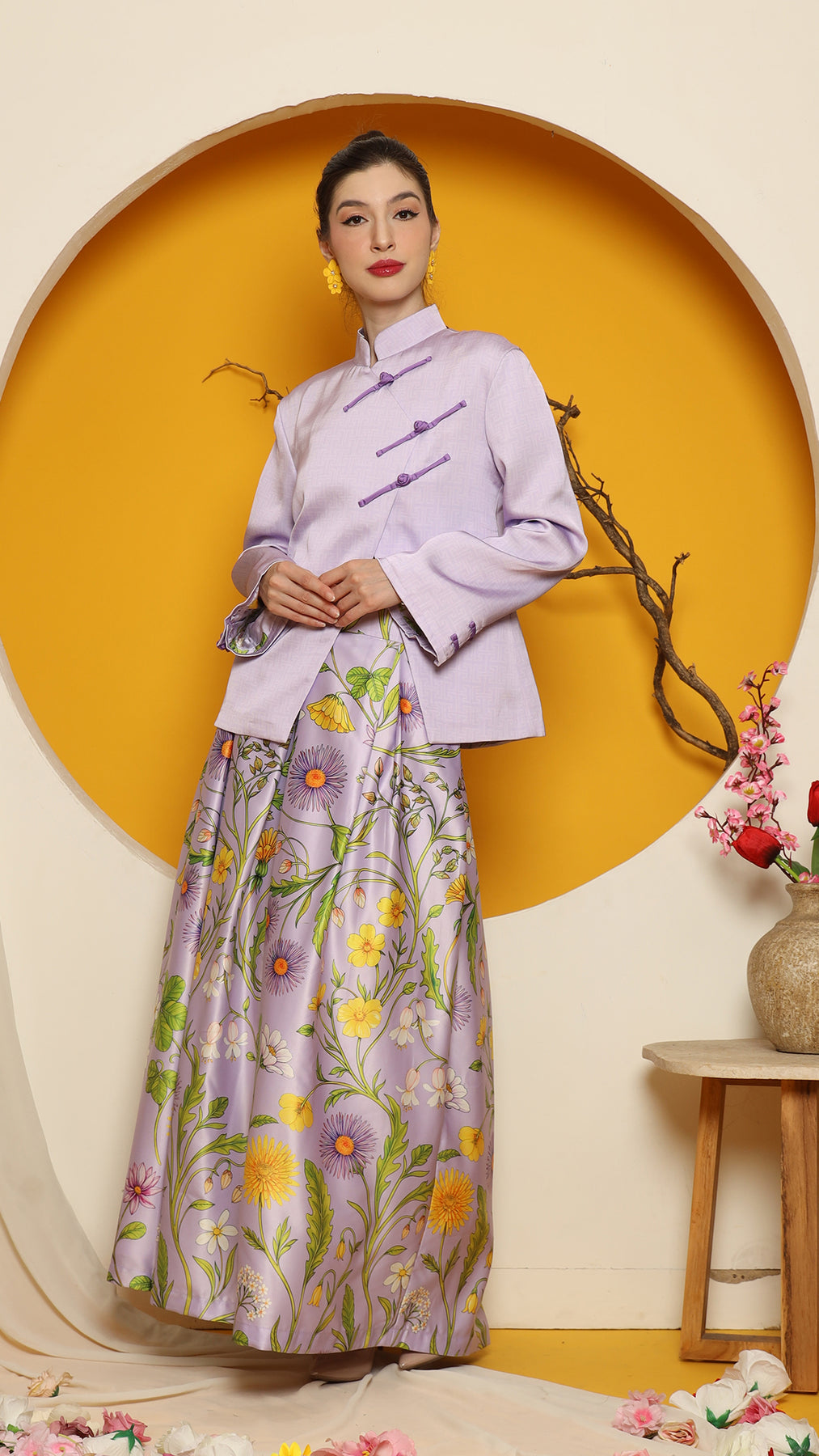 This sophisticated ensemble features a Cheongsham-style jacket with a distinctive overlap front closure and red knot-button detailing. Made from high-quality jacquard fabric, the jacket is fully lined and tailored to a flattering length of 64 cm. The skirt, crafted from premium floral satin, boasts intricate flower motifs, complemented by a chic red fringe hemline for added elegance. It is designed with a back zipper and an elastic waistband for comfort.