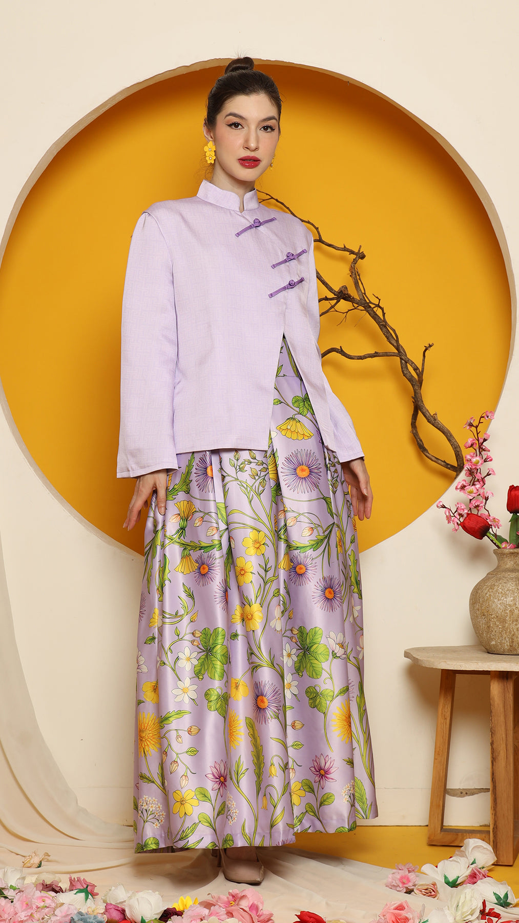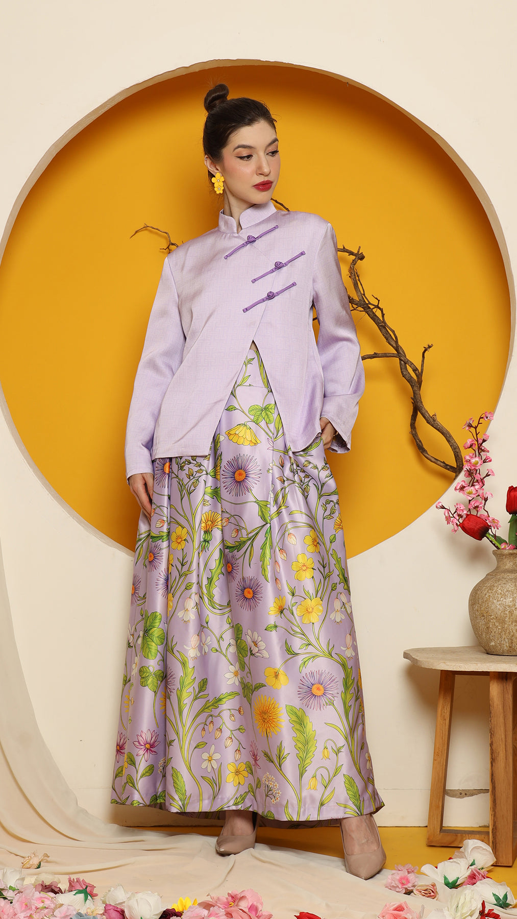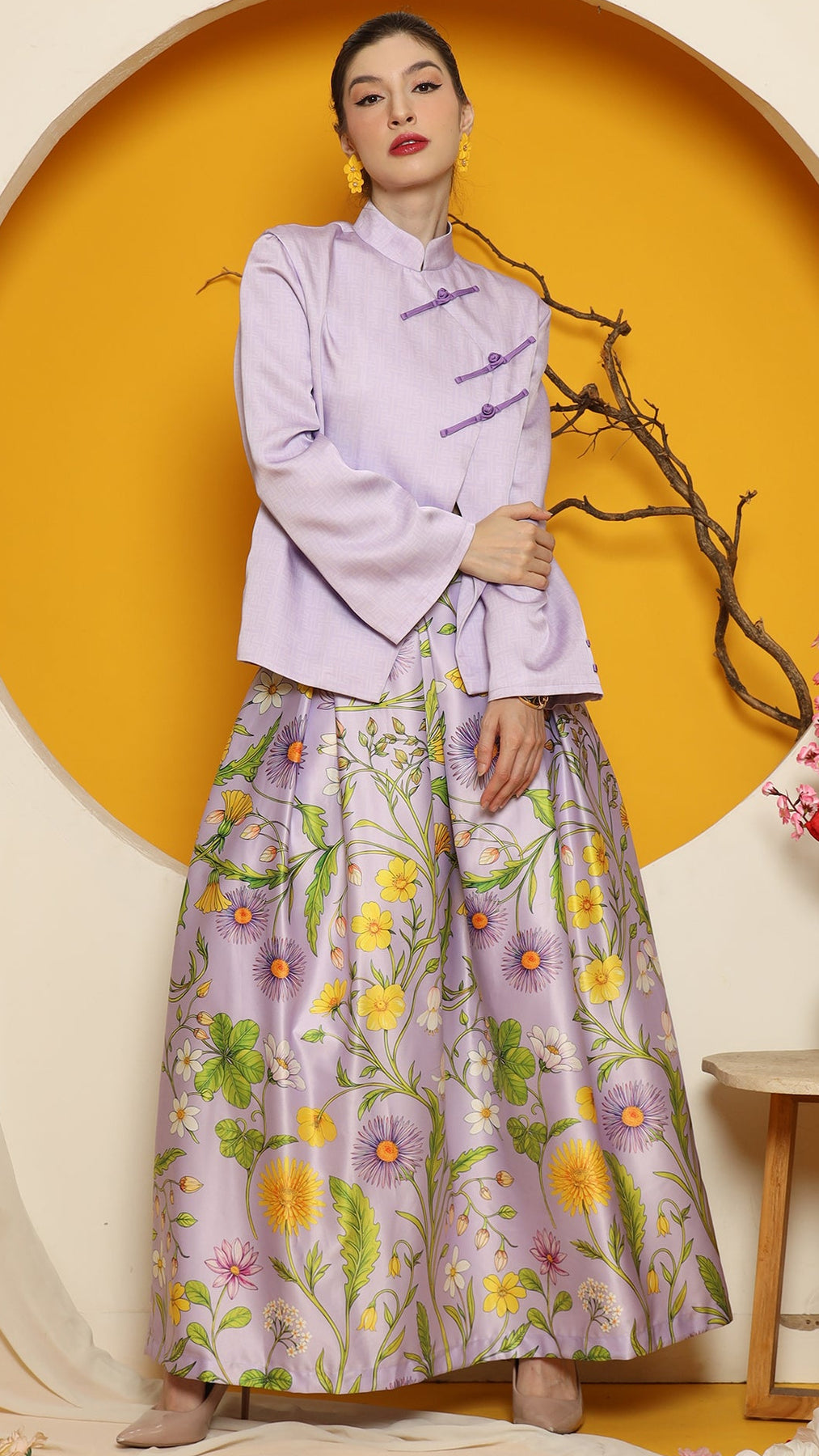 This sophisticated ensemble features a Cheongsham-style jacket with a distinctive overlap front closure and red knot-button detailing. Made from high-quality jacquard fabric, the jacket is fully lined and tailored to a flattering length of 64 cm. The skirt, crafted from premium floral satin, boasts intricate flower motifs, complemented by a chic red fringe hemline for added elegance. It is designed with a back zipper and an elastic waistband for comfort.