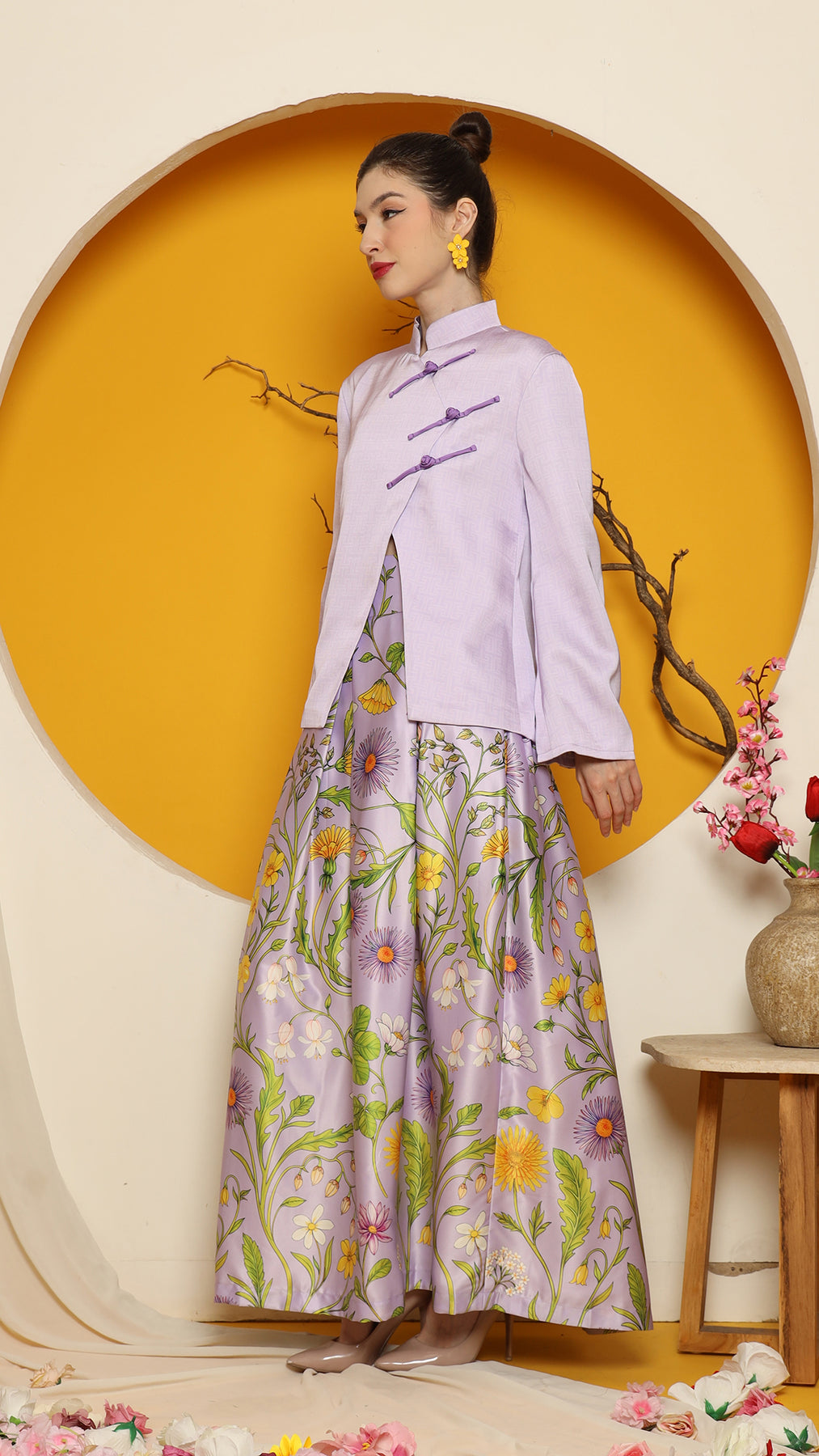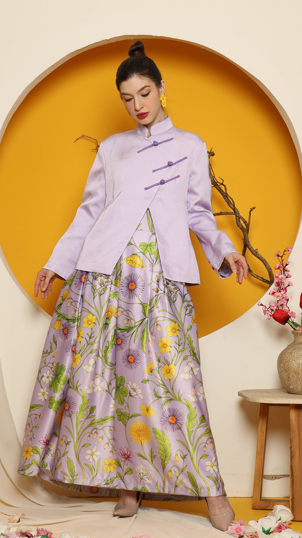 This sophisticated ensemble features a Cheongsham-style jacket with a distinctive overlap front closure and red knot-but