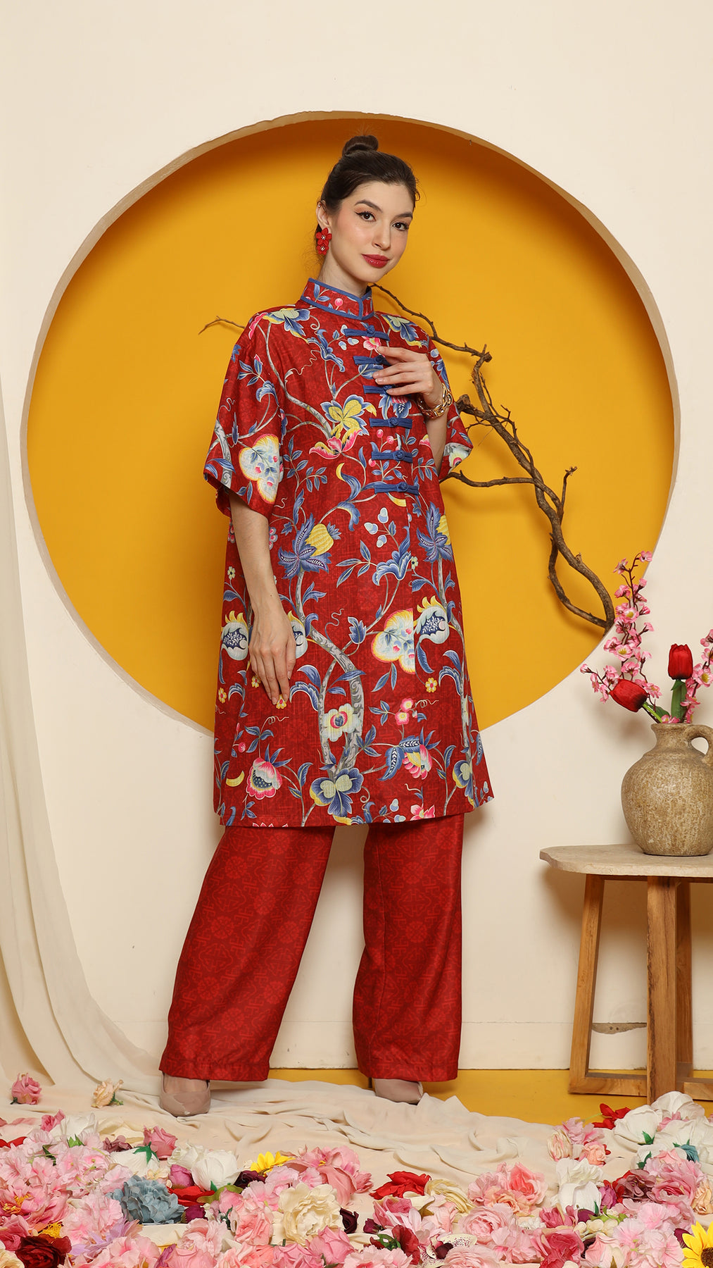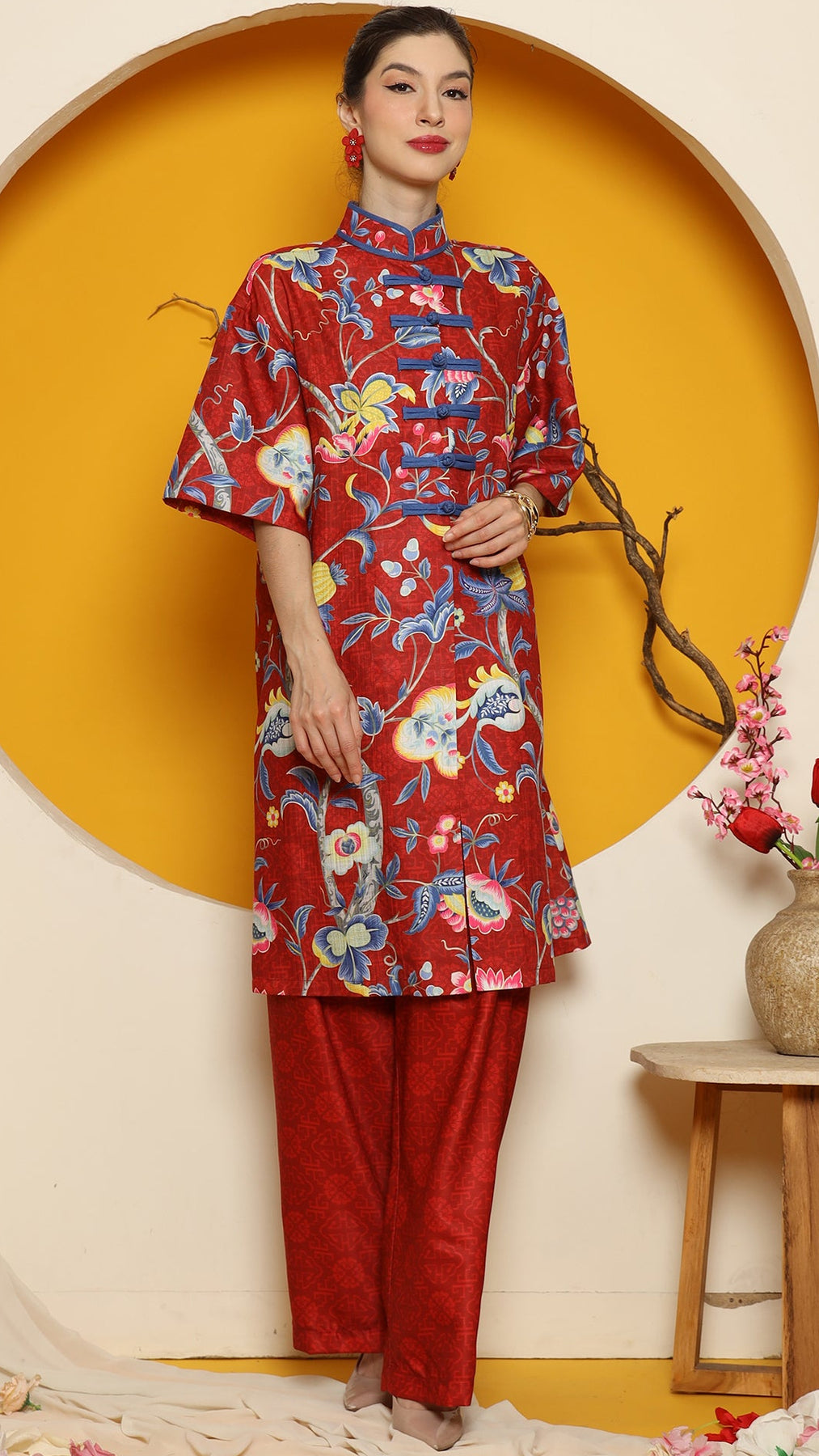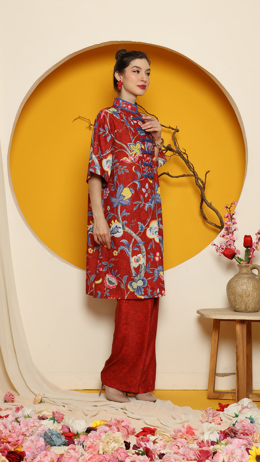 This premium-quality cheongsam exudes timeless elegance with its delicate floral print and sophisticated design. Featuring a free-size fit and an open-front style, it offers versatility and ease of wear. The 100 cm length ensures a graceful silhouette, making it suitable for various occasions. Crafted from high-quality material, this piece combines comfort and luxury effortlessly. Perfectly paired with matching pants for a complete, refined look.