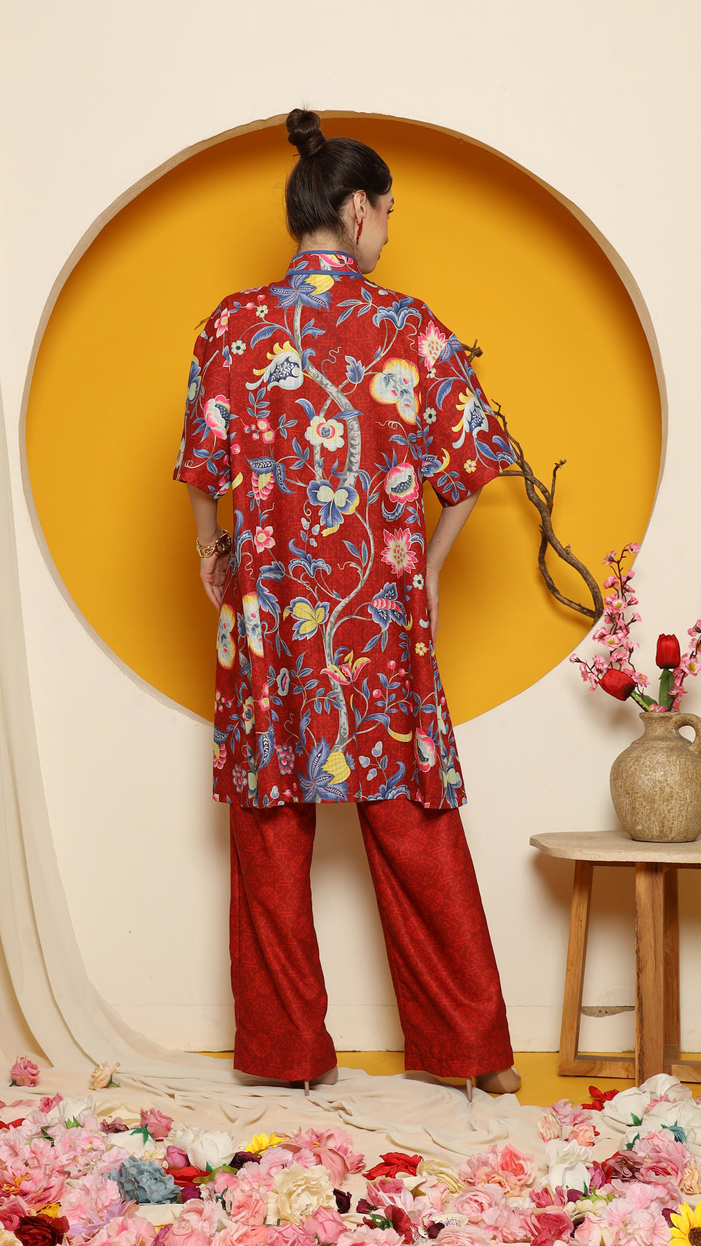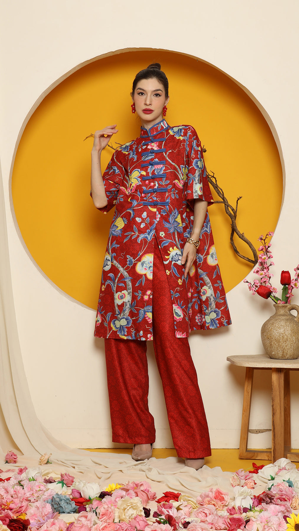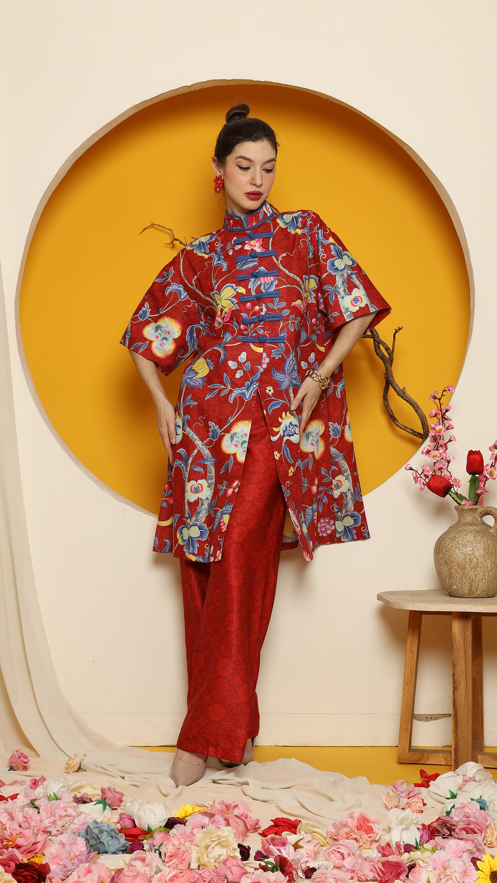 This premium-quality cheongsam exudes timeless elegance with its delicate floral print and sophisticated design. Featuring a free-size fit and an open-front style, it offers versatility and ease of wear. The 100 cm length ensures a graceful silhouette, making it suitable for various occasions. Crafted from high-quality material, this piece combines comfort and luxury effortlessly. Perfectly paired with matching pants for a complete, refined look.